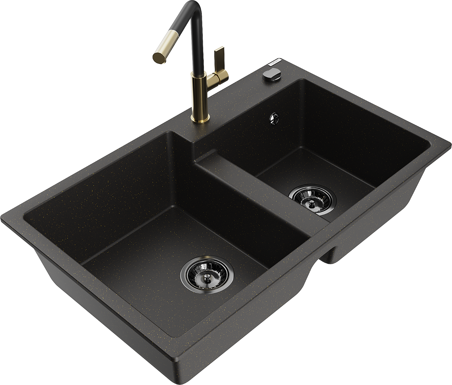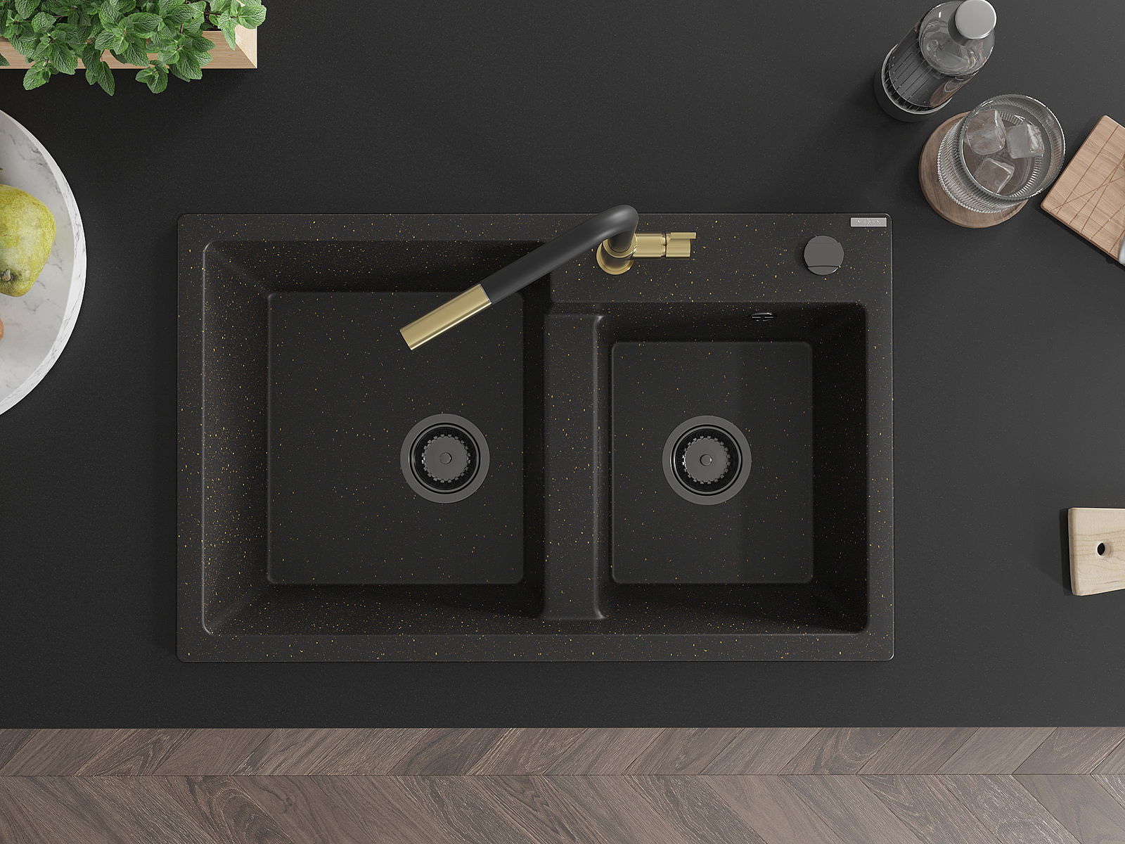 Mexen Tomas granite sink 2-bowl with Flora kitchen tap, black/gold metallic - 6516-75-670401-57-B