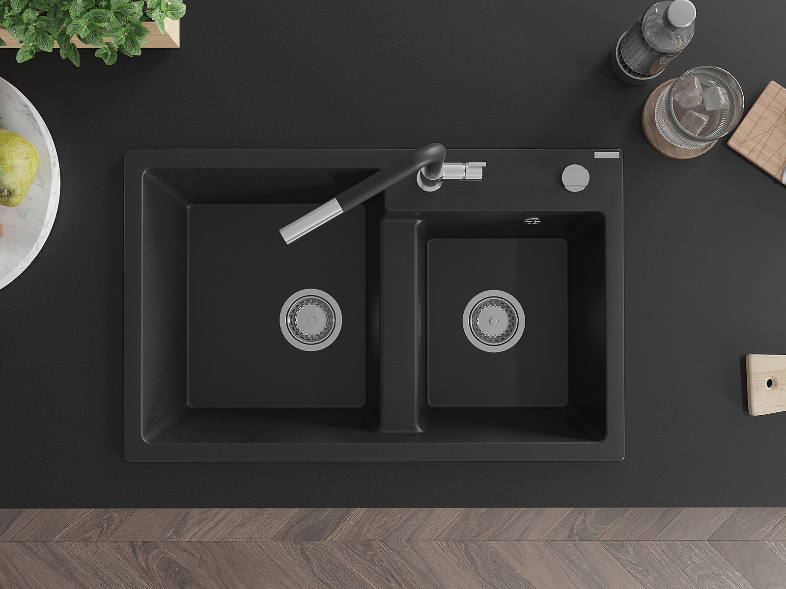 Mexen Tomas 2-bowl granite sink with Flora kitchen tap, black - 6516-77-670401-07