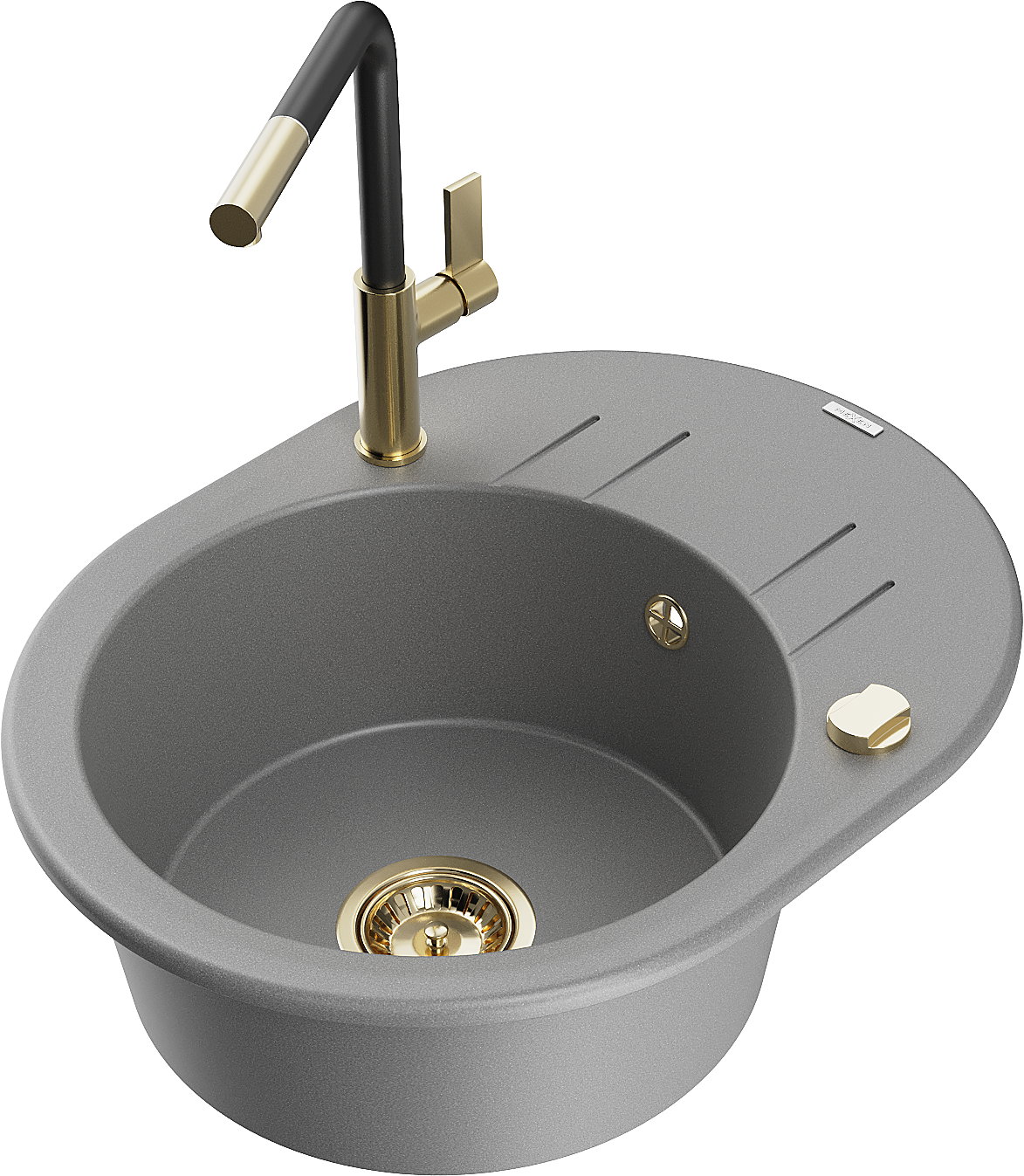 Mexen Kevin granite sink 1-bowl with drainer and Flora kitchen tap, grey - 6517-71-670401-57-G