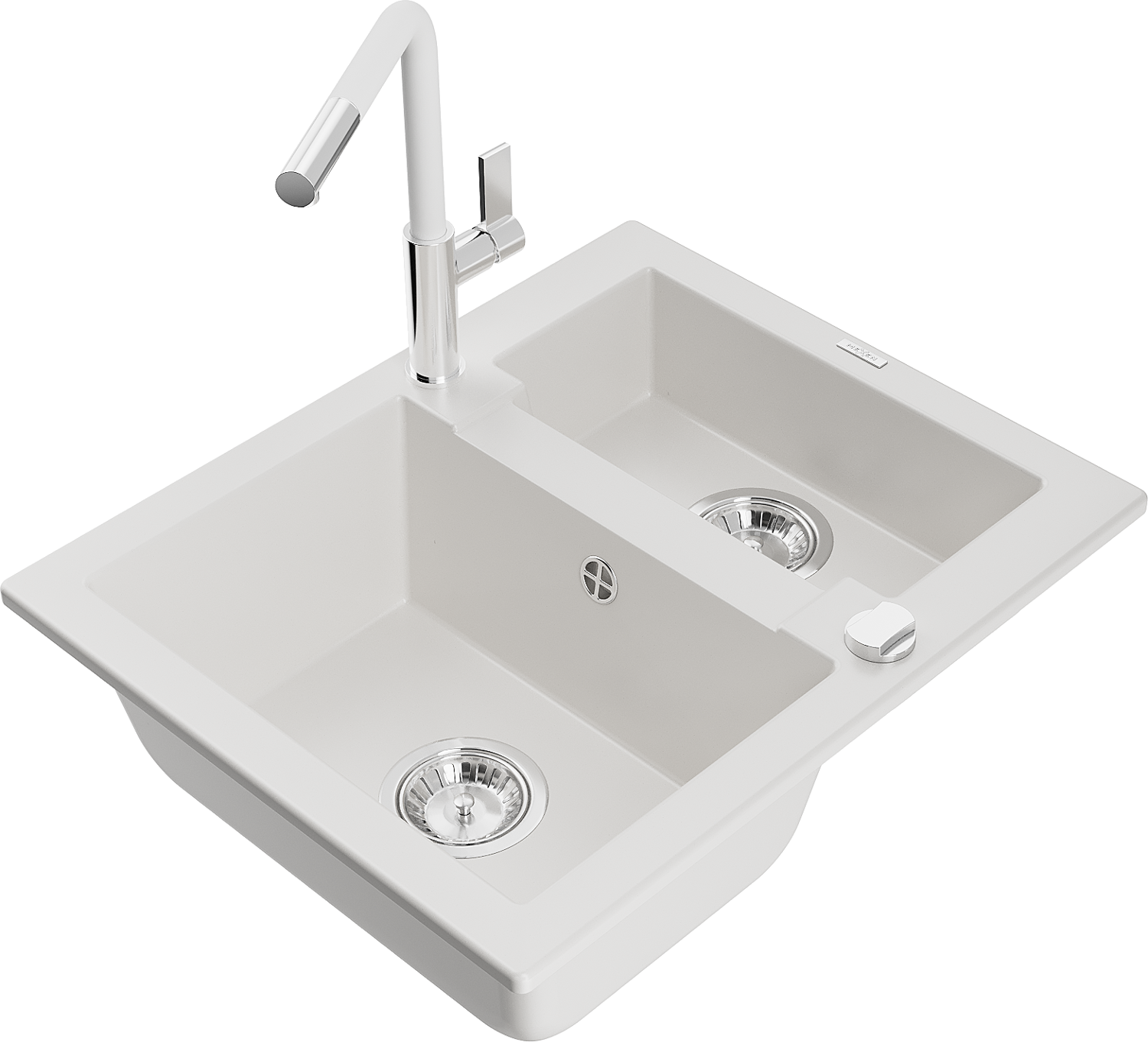 Mexen Carlos granite sink 1.5-bowl with Flora kitchen tap, white - 6518-20-670401-02