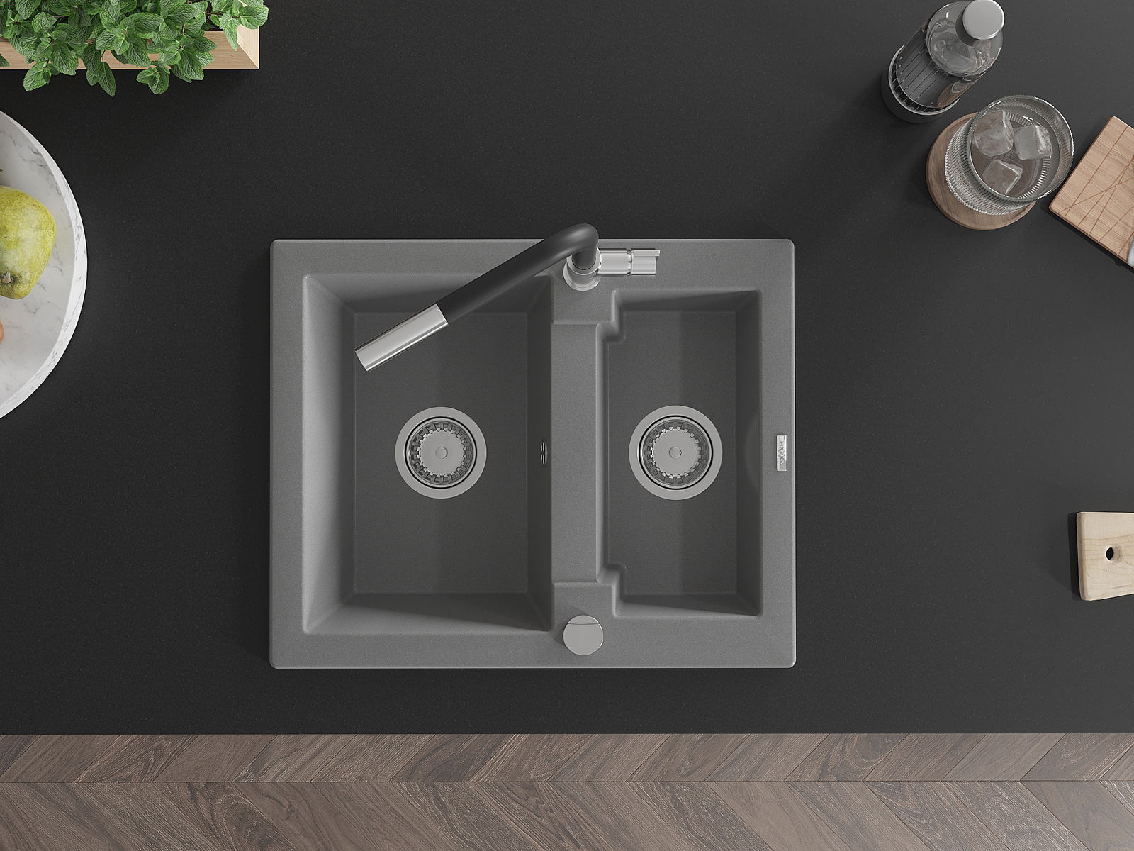 Mexen Carlos granite sink 1.5-bowl with Flora kitchen tap, grey - 6518-71-670401-07
