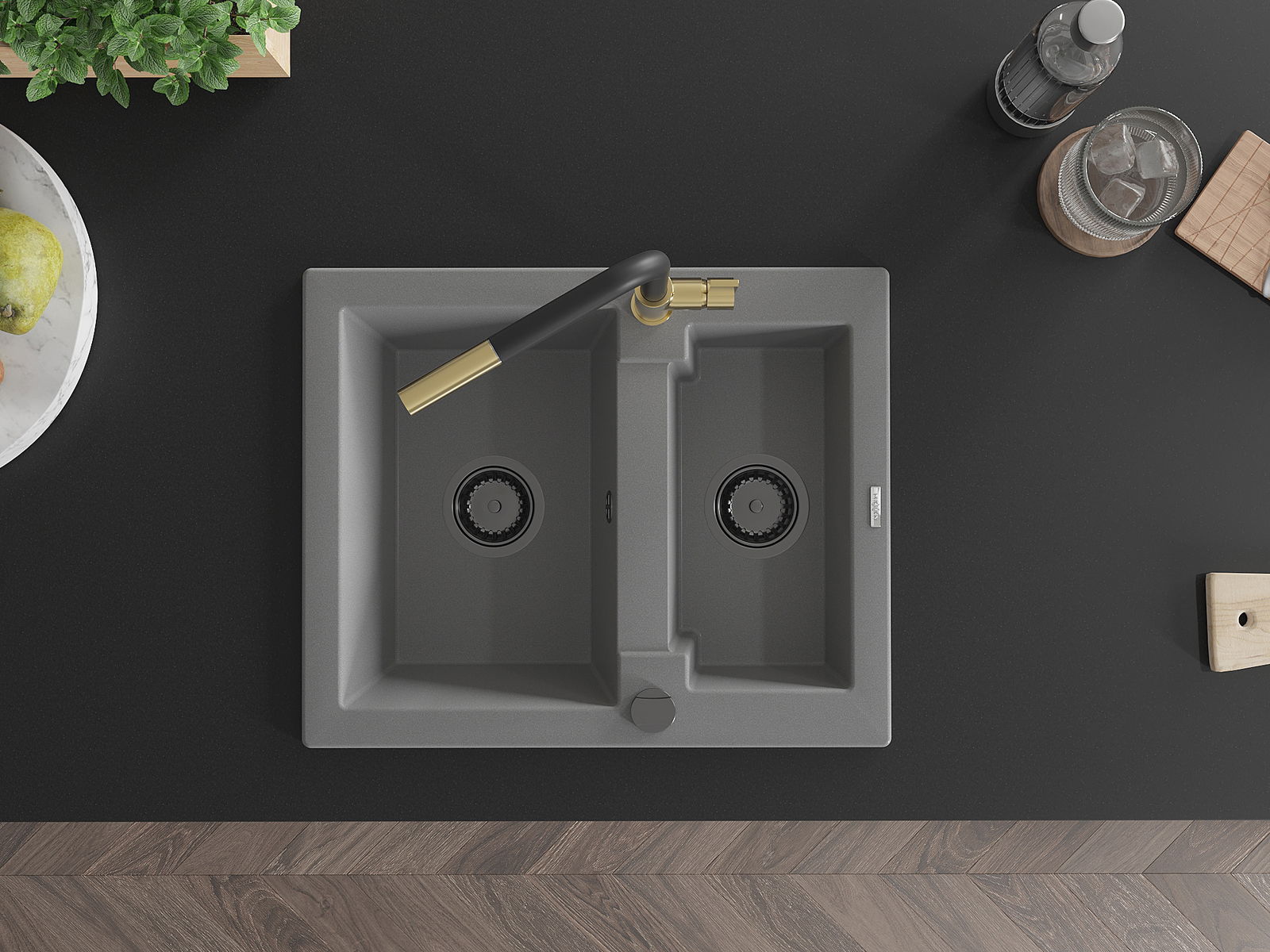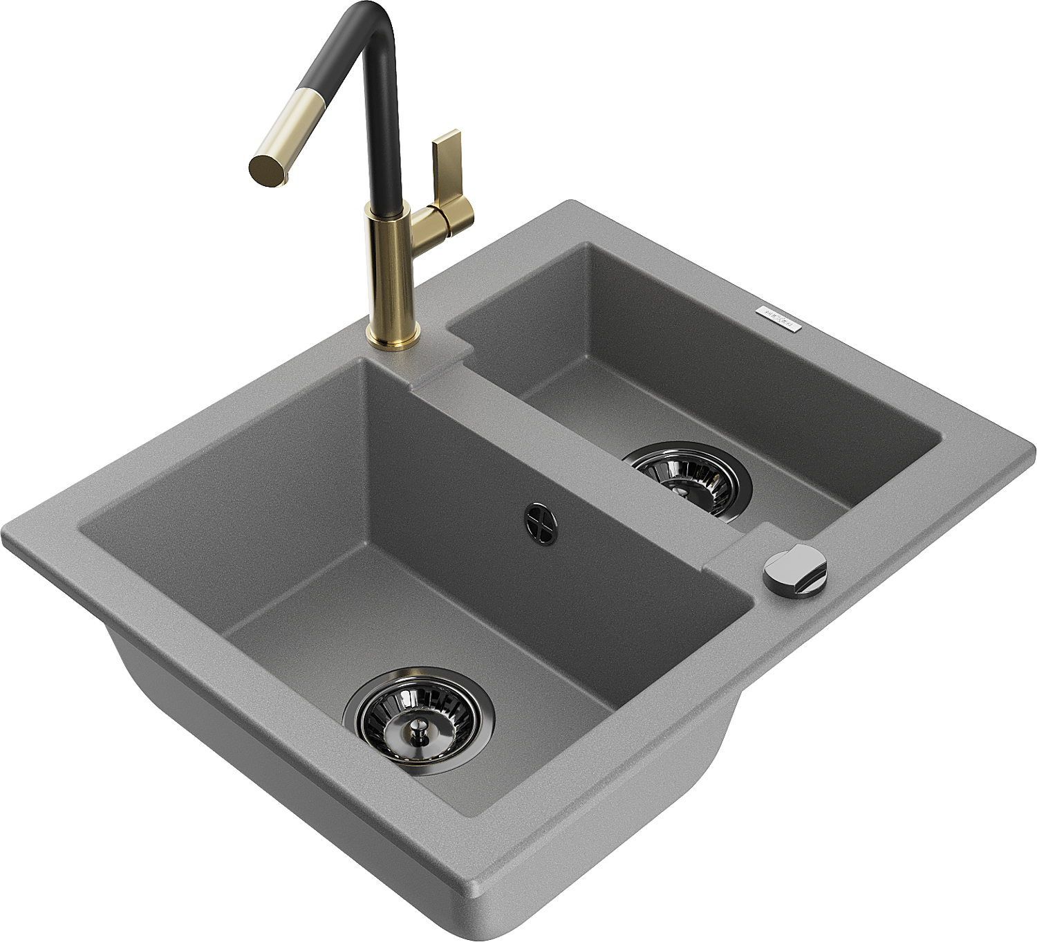 Mexen Carlos granite sink 1.5-bowl with Flora kitchen tap, grey - 6518-71-670401-57-B
