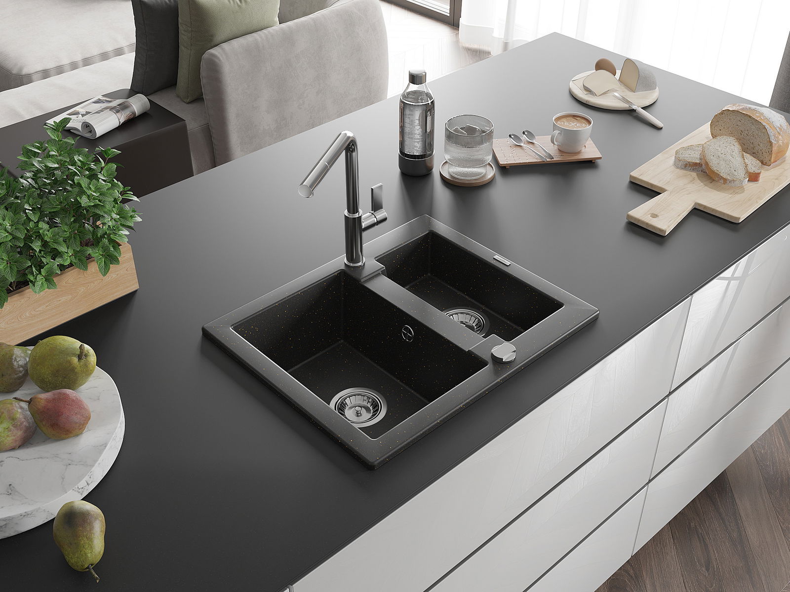 The sink is made of high quality granite. It is an elegant and, above all, practical complement to every kitchen, regardless of its style. High quality and granite durability ensure many years of use.