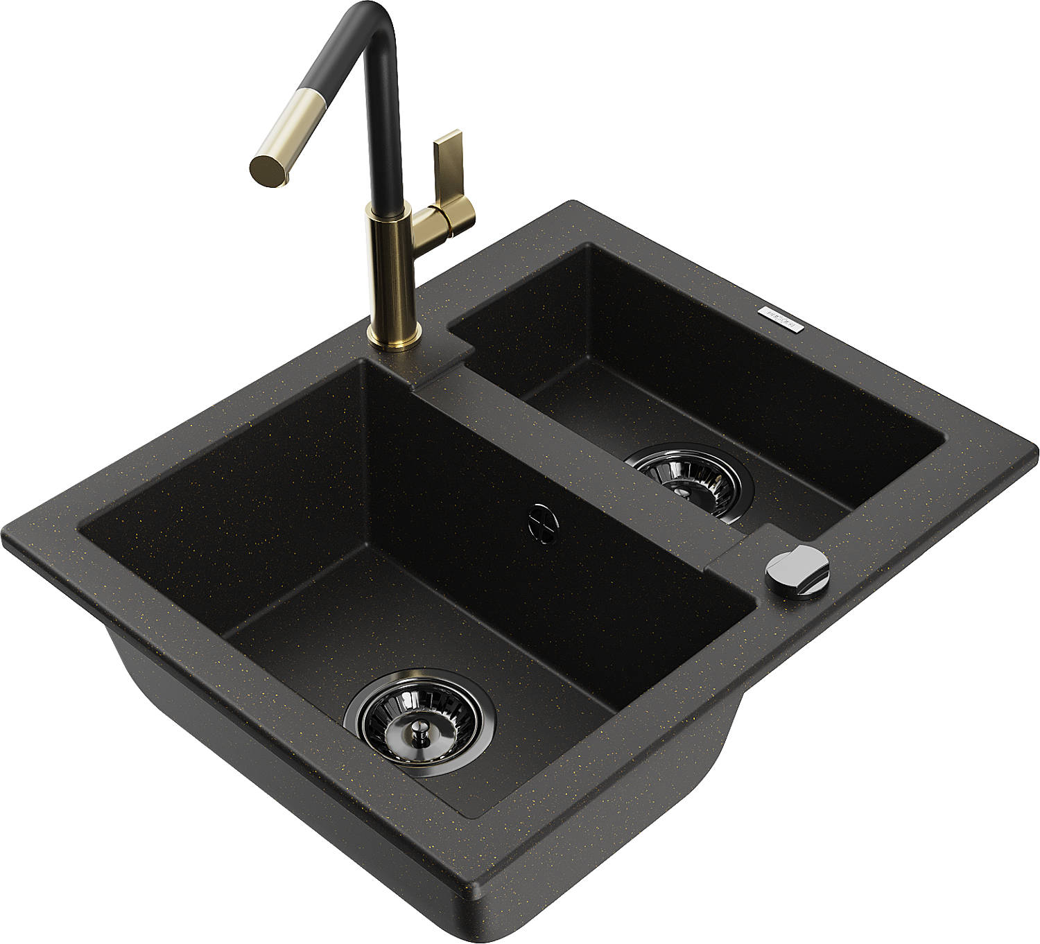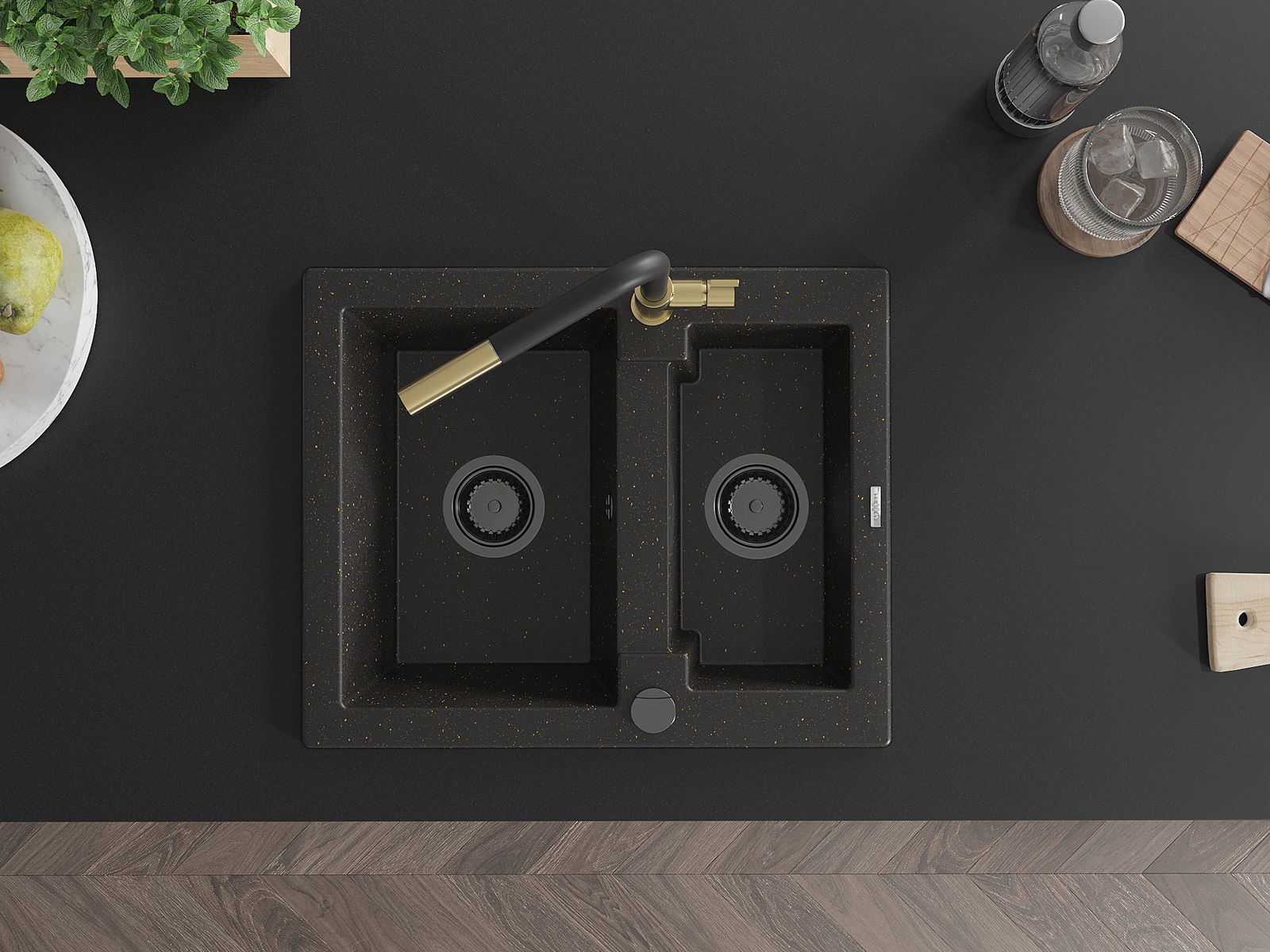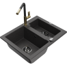 Mexen Carlos granite sink 1.5-bowl with Flora kitchen tap, black/gold metallic - 6518-75-670401-57-B