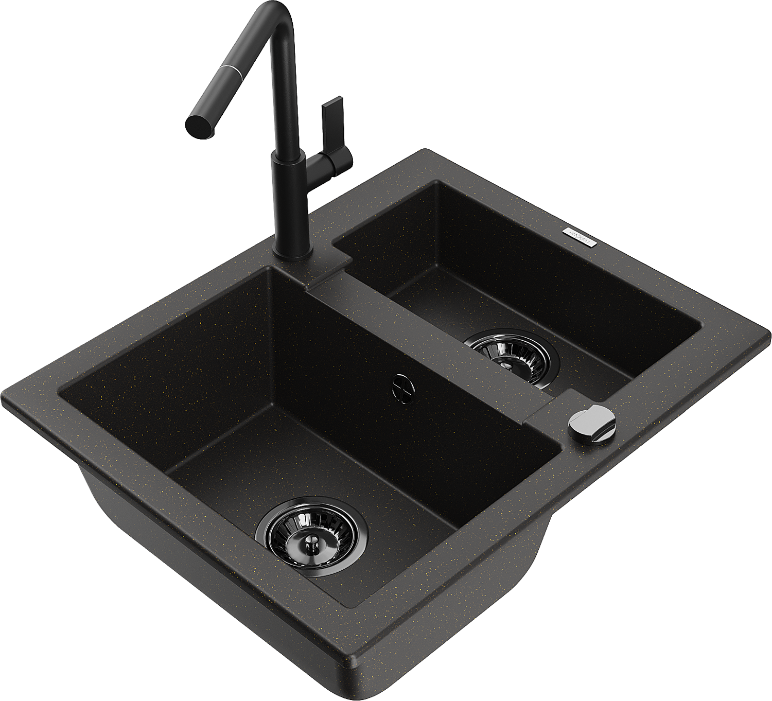 Mexen Carlos 1.5-bowl granite sink with Flora kitchen tap, black/gold metallic - 6518-75-670401-70-B