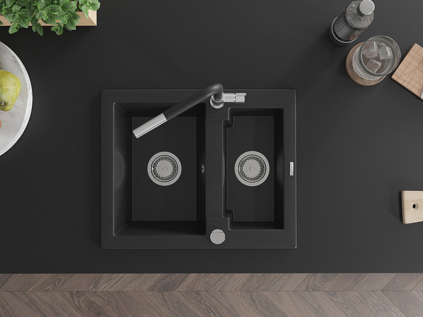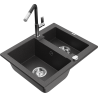 Mexen Carlos granite sink 1.5-bowl with Flora kitchen tap, black - 6518-77-670401-07