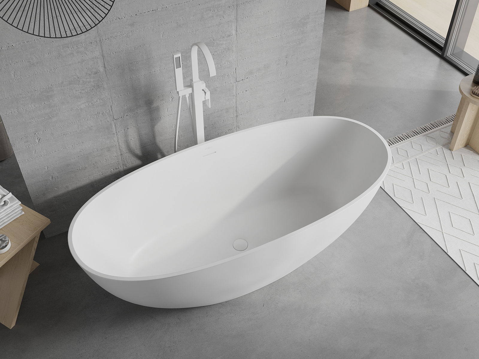 Mexen Bari is an elegant freestanding bath made of conglomerate, measuring 165 x 75 cm. It features a modern, oval shape and a matte finish in white, giving it a stylish look. The bath is resistant to matting and UV radiation, ensuring material durability. Additionally, it includes an overflow hole and a siphon with a click-clack plug. Ideal choice for those seeking functional and aesthetic solutions for their bathroom.