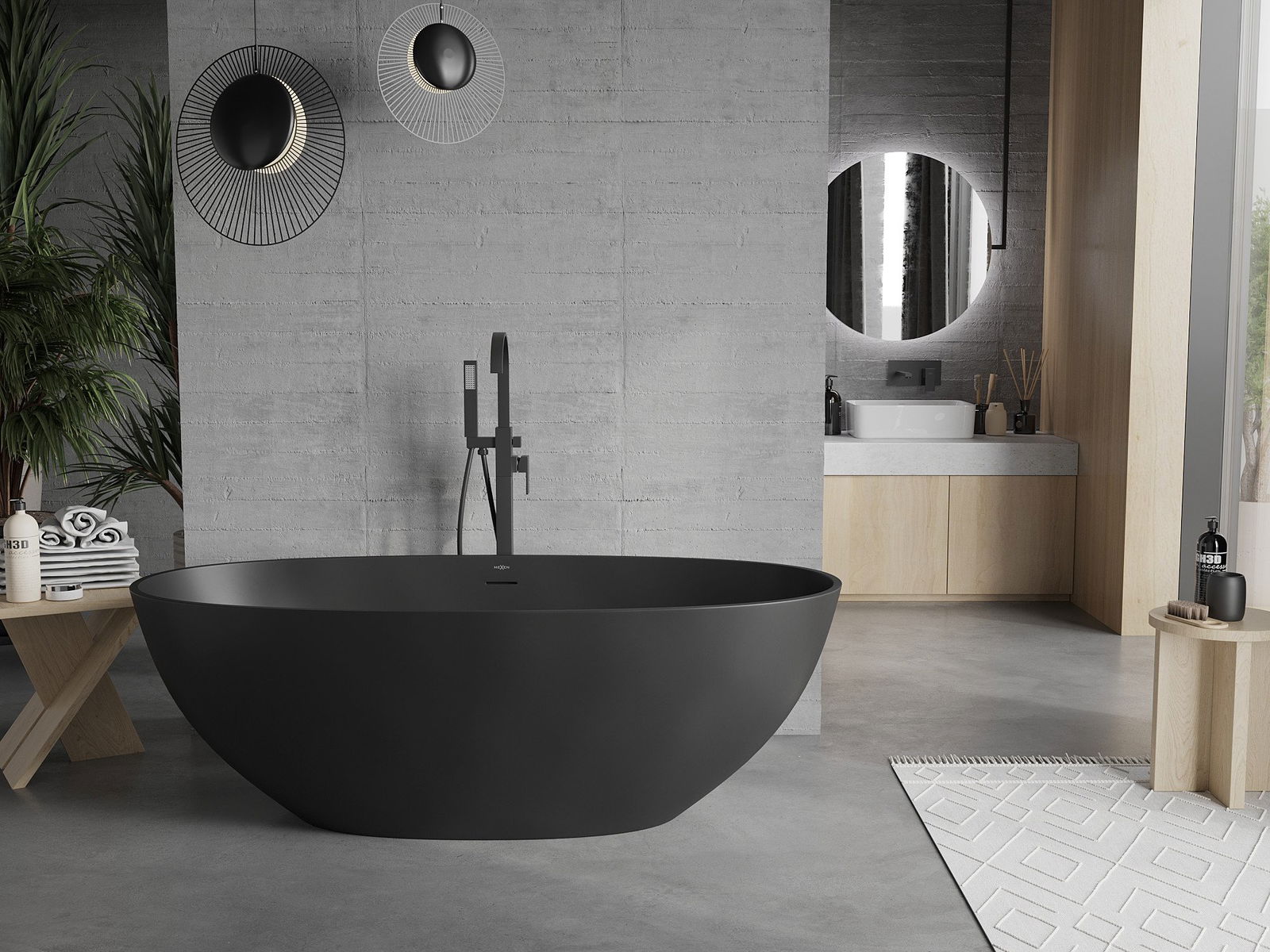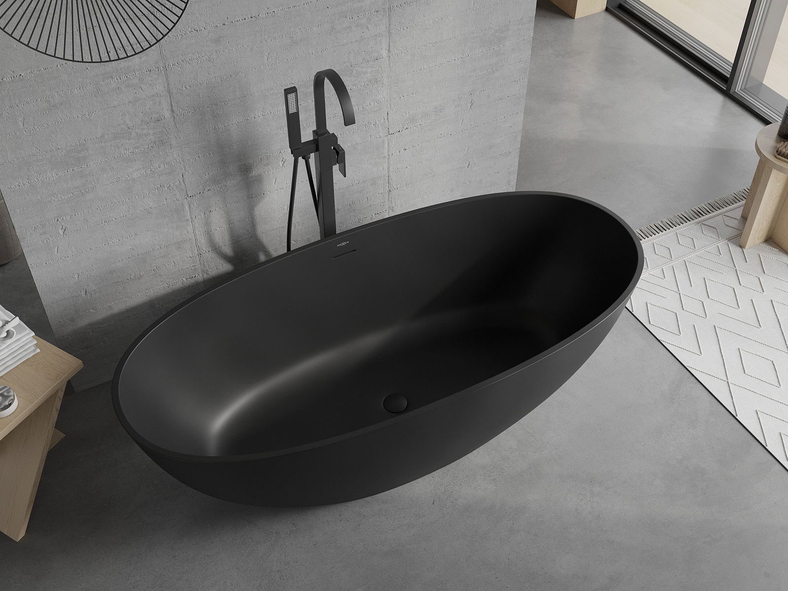The freestanding bath 165 x 75 cm made of conglomerate is an excellent choice for lovers of modern design. Its oval shape and matte black finish catch the eye, adding elegance to any bathroom. The product is resistant to dulling and UV radiation, ensuring long-lasting use. Additionally, the bath is equipped with a practical overflow and a siphon with a click-clack plug, which increases user comfort. The height of 55 cm and depth of 43 cm guarantee comfort during bathing.