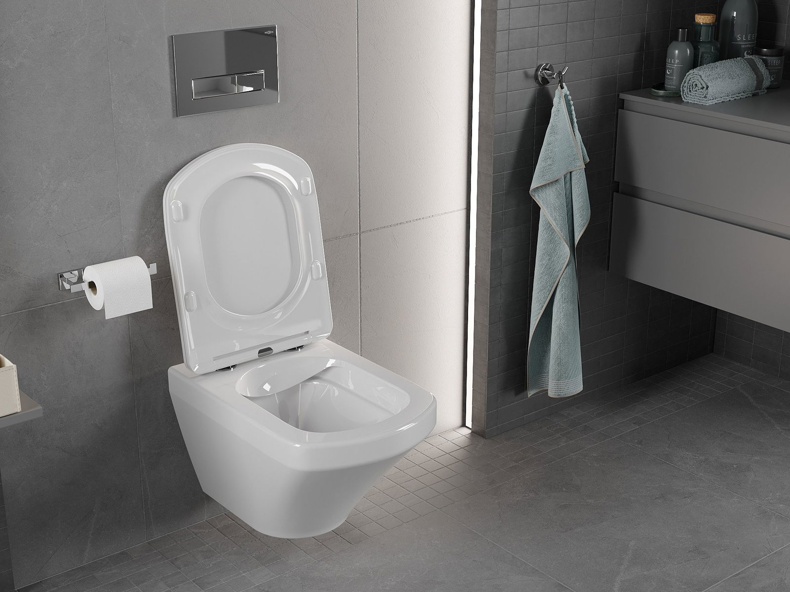 A modern system in which all mounting elements have been hidden. This is not only aesthetic, but also a very practical solution. It makes it easier to keep the bathroom clean and ensures a neat appearance of the bathroom.