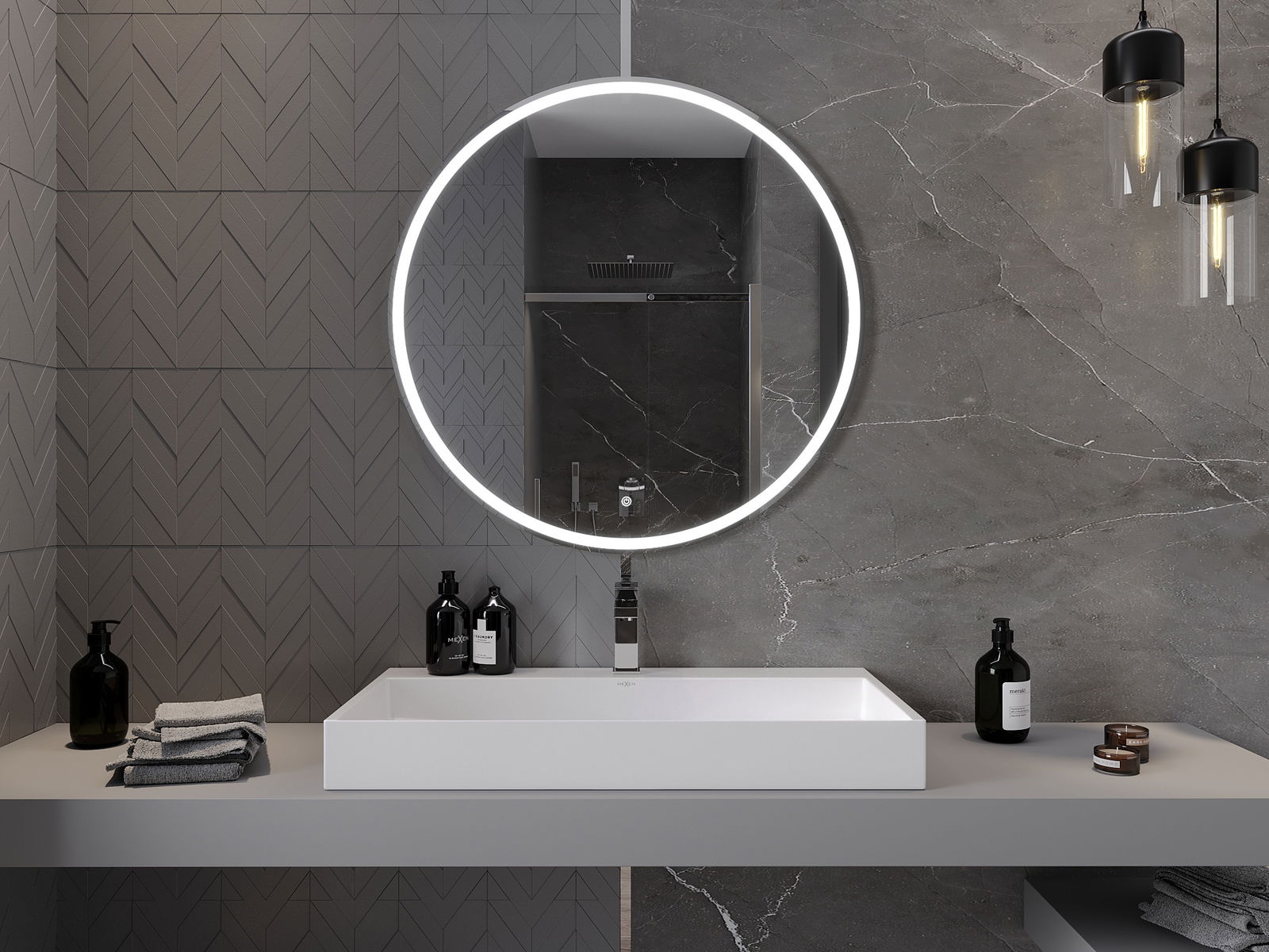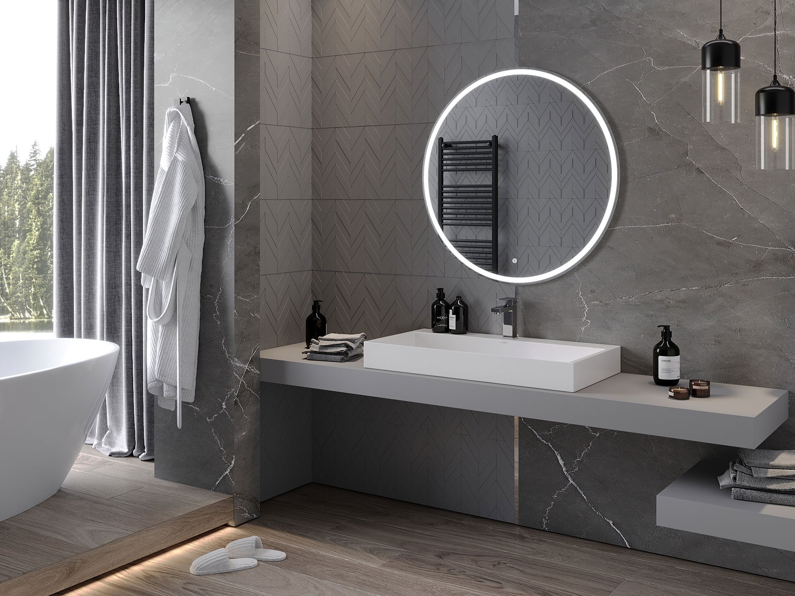 LED backlighting at the mirror is a practical element that makes daily grooming easier by providing the perfect illumination of the face. The backlighting gives the bathroom a modern finish, highlighting its elegant decor.