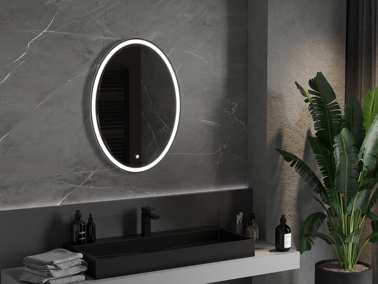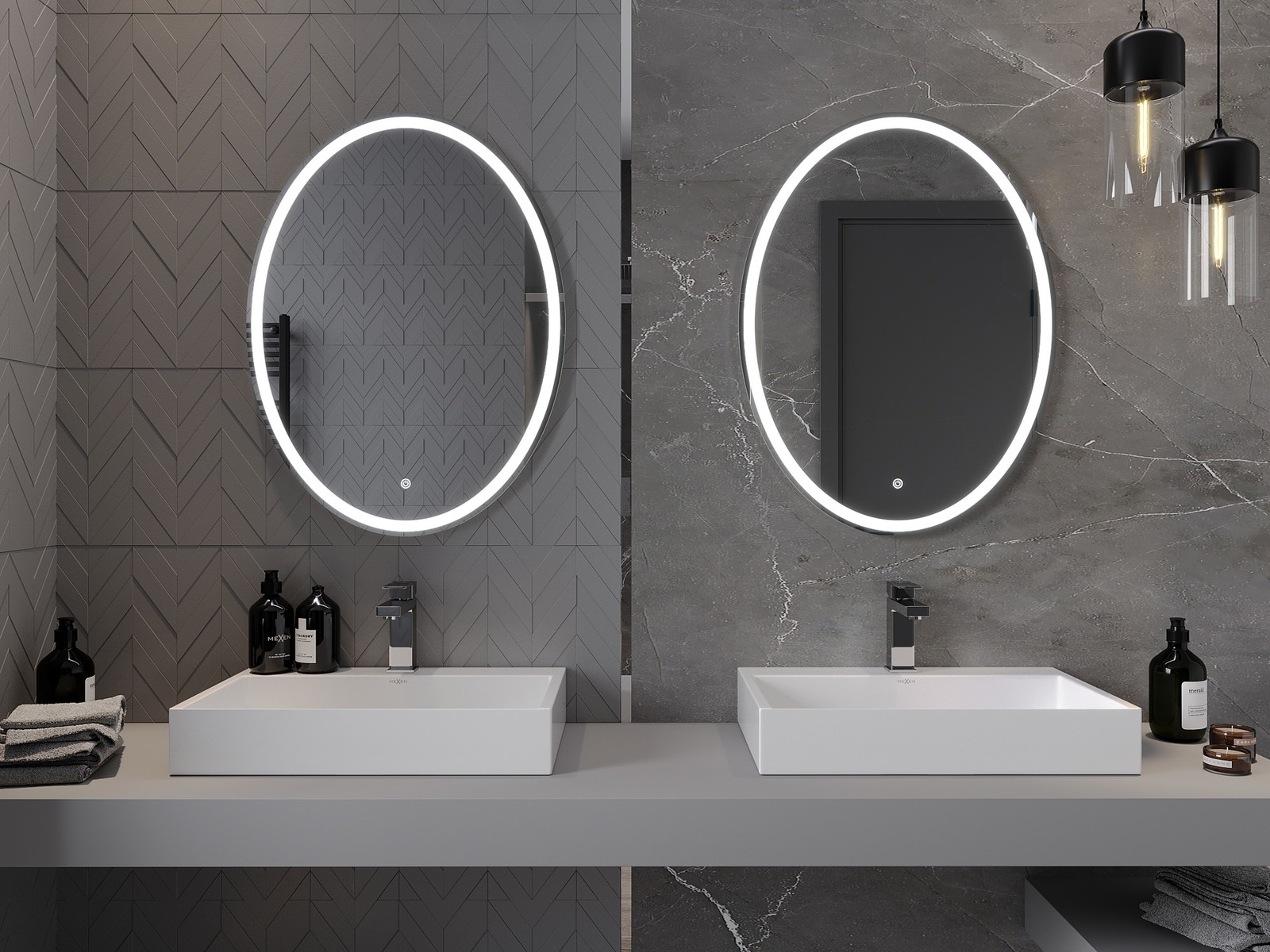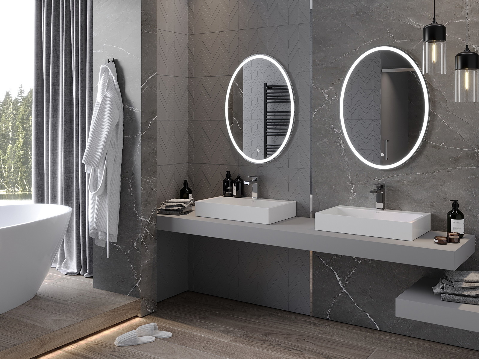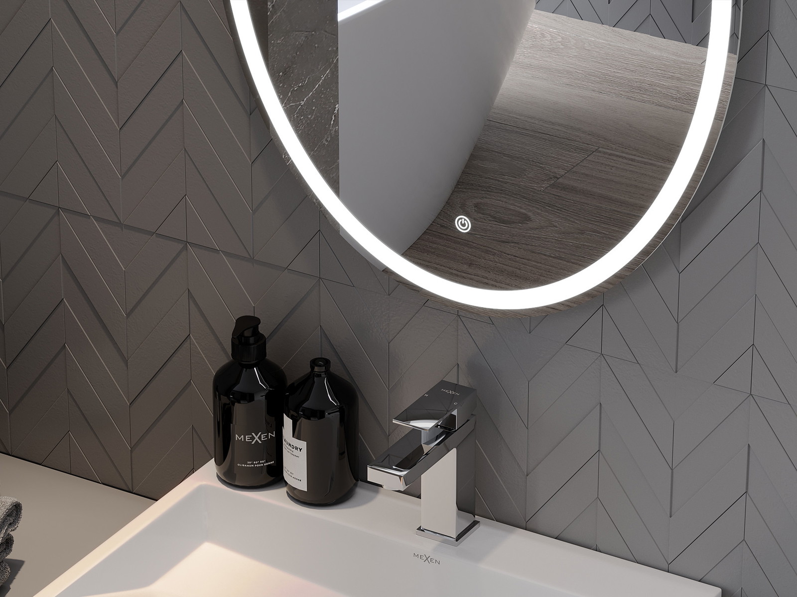 LED backlighting at the mirror is a practical element that makes daily grooming easier by providing the perfect illumination of the face. The backlighting gives the bathroom a modern finish, highlighting its elegant decor.