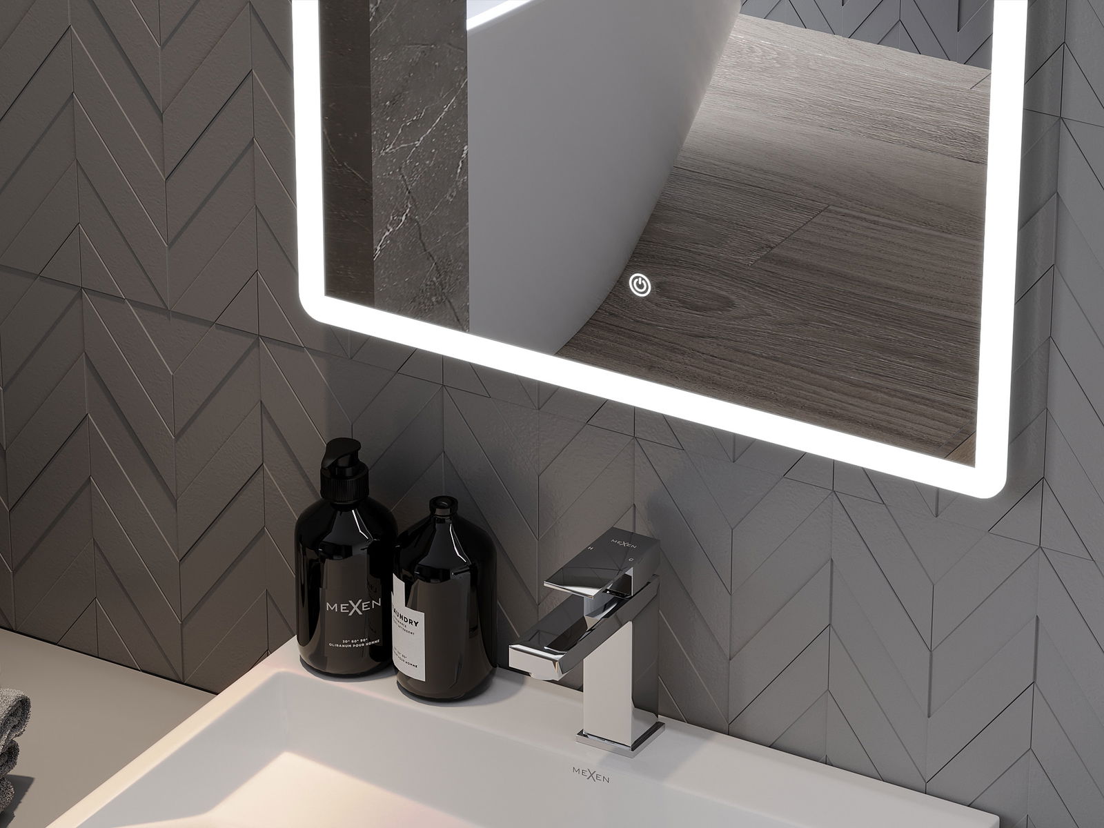 LED backlighting at the mirror is a practical element that makes daily grooming easier by providing the perfect illumination of the face. The backlighting gives the bathroom a modern finish, highlighting its elegant decor.