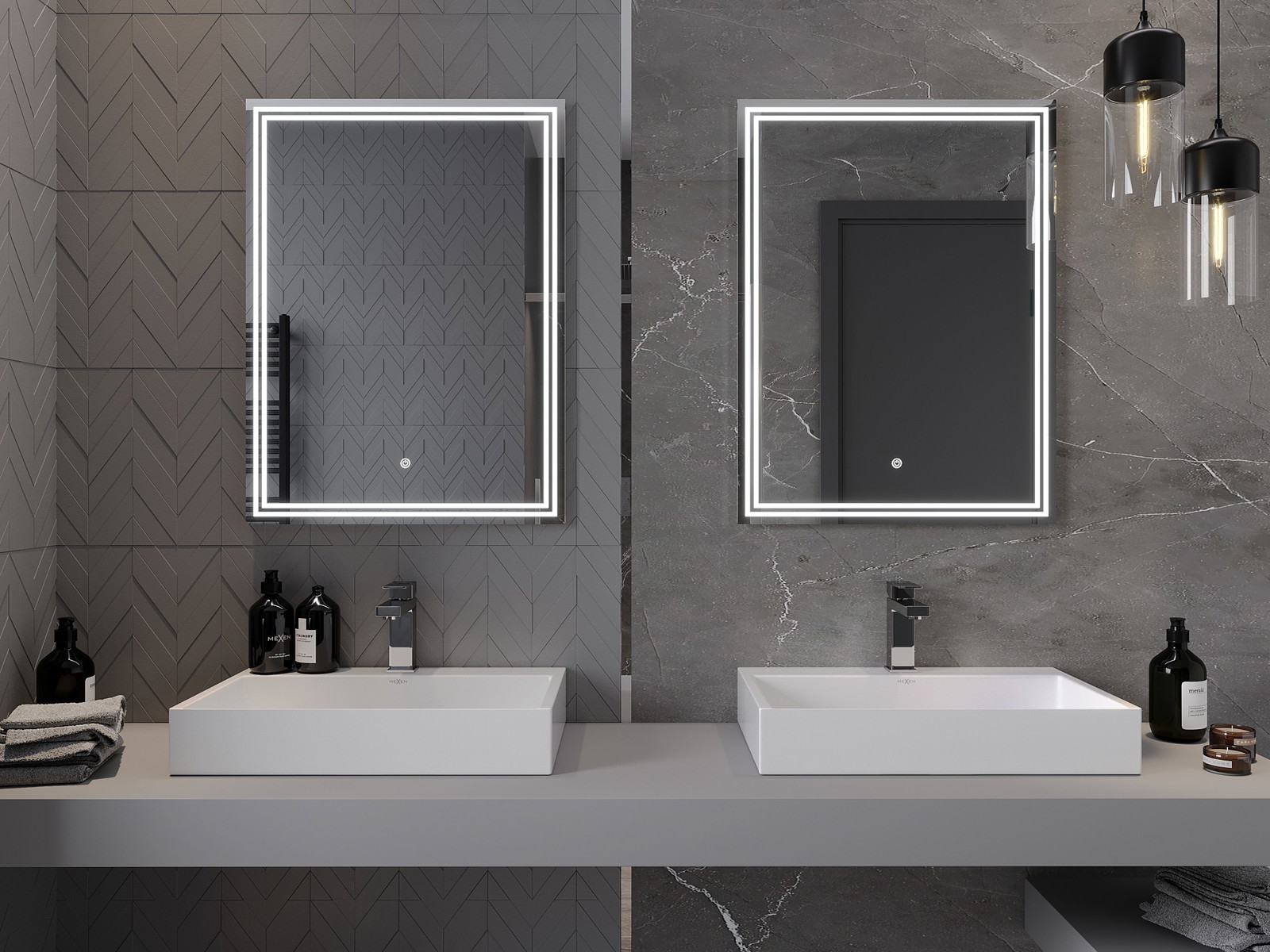 LED backlighting at the mirror is a practical element that makes daily grooming easier by providing the perfect illumination of the face. The backlighting gives the bathroom a modern finish, highlighting its elegant decor.