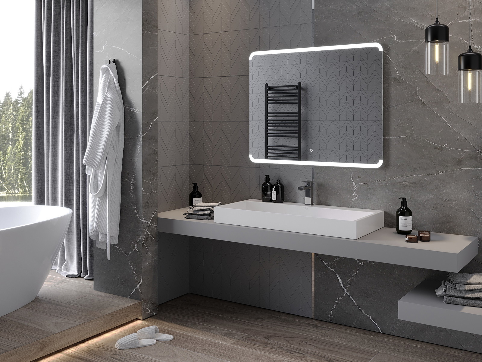 LED backlighting at the mirror is a practical element that makes daily grooming easier by providing the perfect illumination of the face. The backlighting gives the bathroom a modern finish, highlighting its elegant decor.