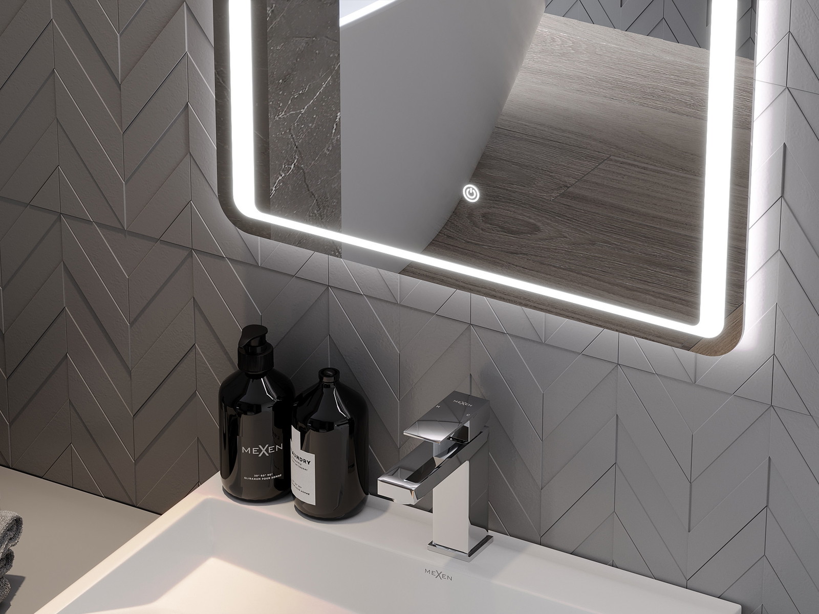 LED backlighting at the mirror is a practical element that makes daily grooming easier by providing the perfect illumination of the face. The backlighting gives the bathroom a modern finish, highlighting its elegant decor.