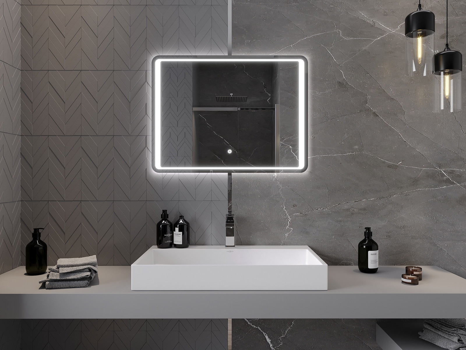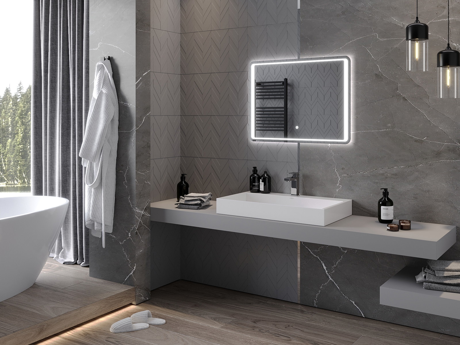 LED backlighting at the mirror is a practical element that makes daily grooming easier by providing the perfect illumination of the face. The backlighting gives the bathroom a modern finish, highlighting its elegant decor.