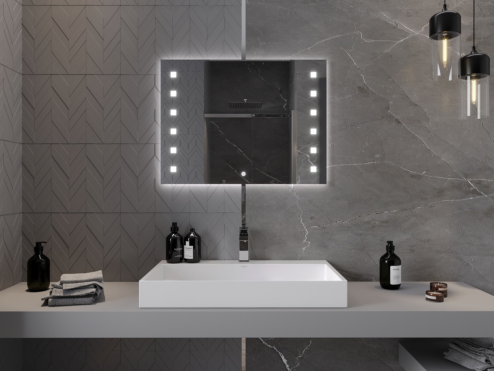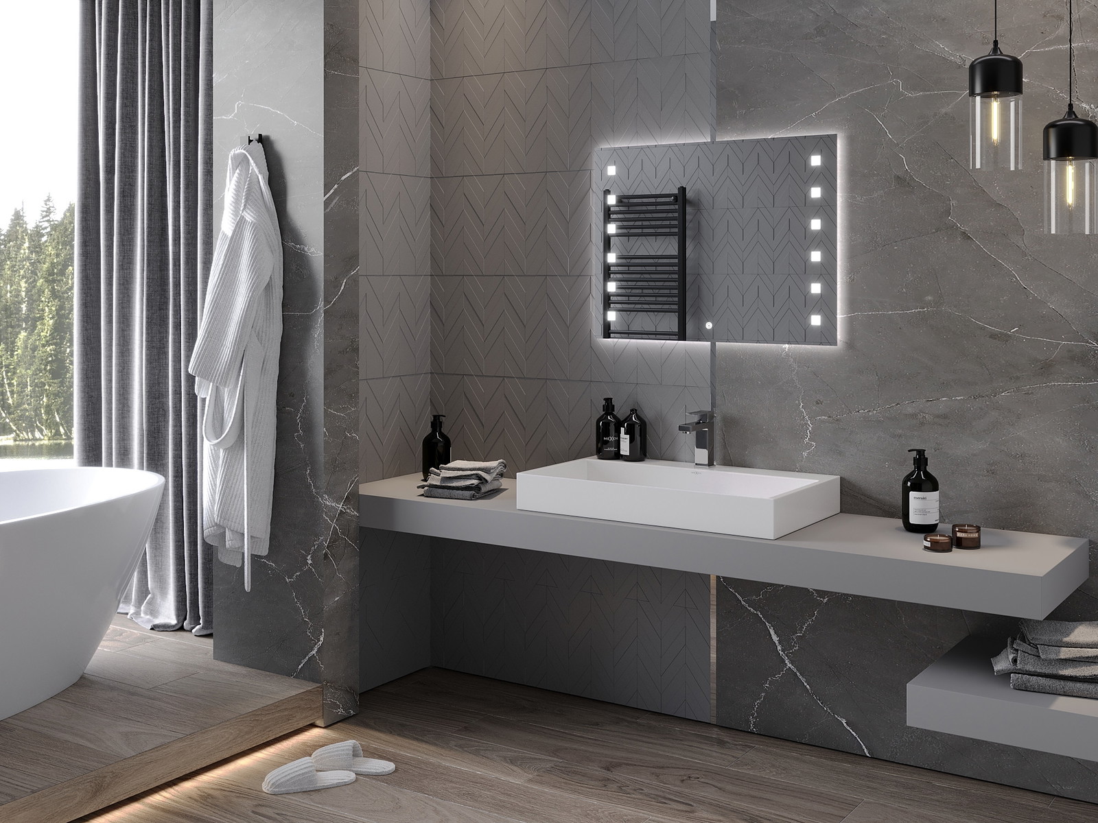 LED backlighting at the mirror is a practical element that makes daily grooming easier by providing the perfect illumination of the face. The backlighting gives the bathroom a modern finish, highlighting its elegant decor.