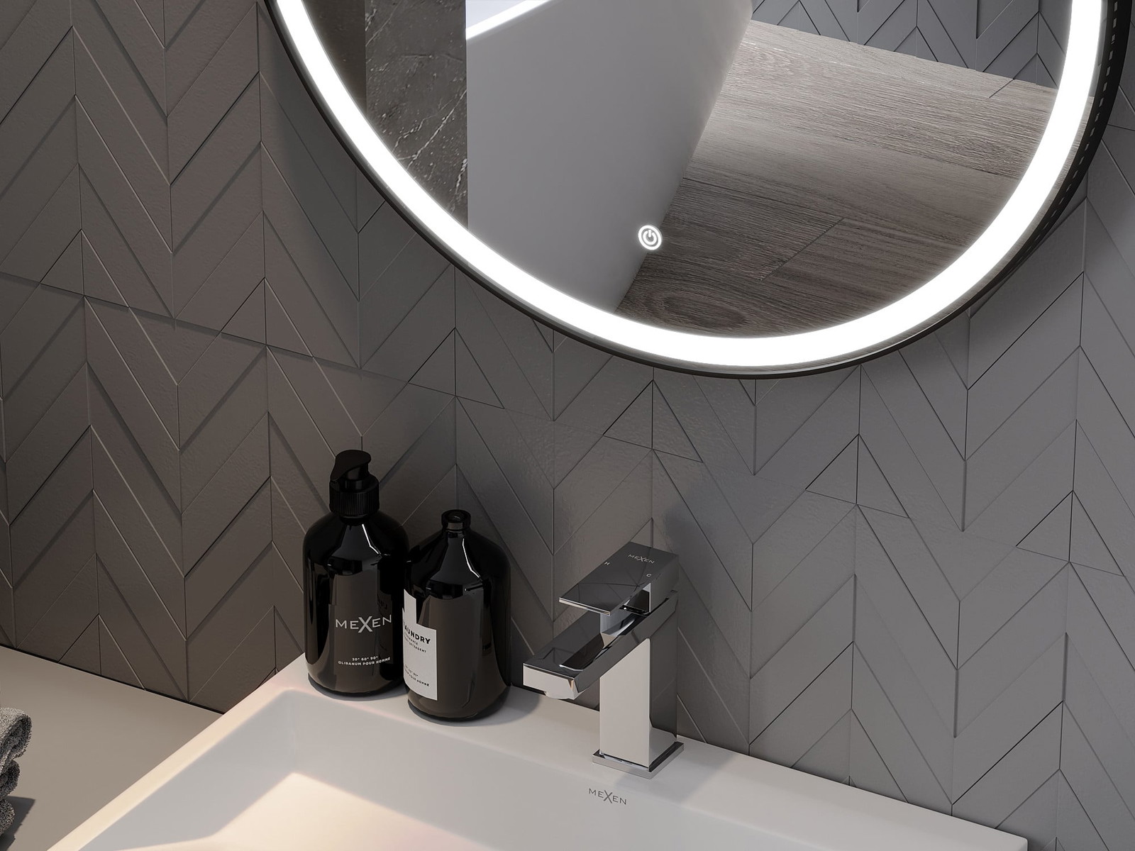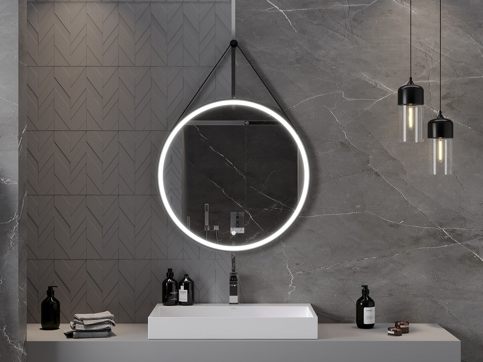 LED backlighting at the mirror is a practical element that makes daily grooming easier by providing the perfect illumination of the face. The backlighting gives the bathroom a modern finish, highlighting its elegant decor.