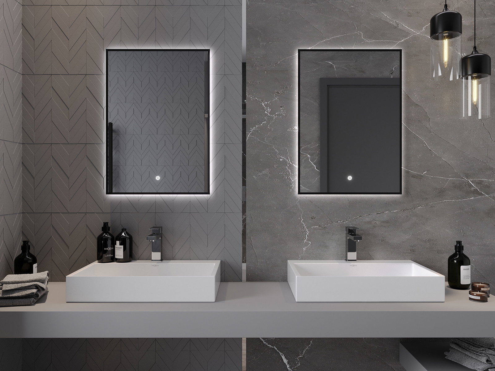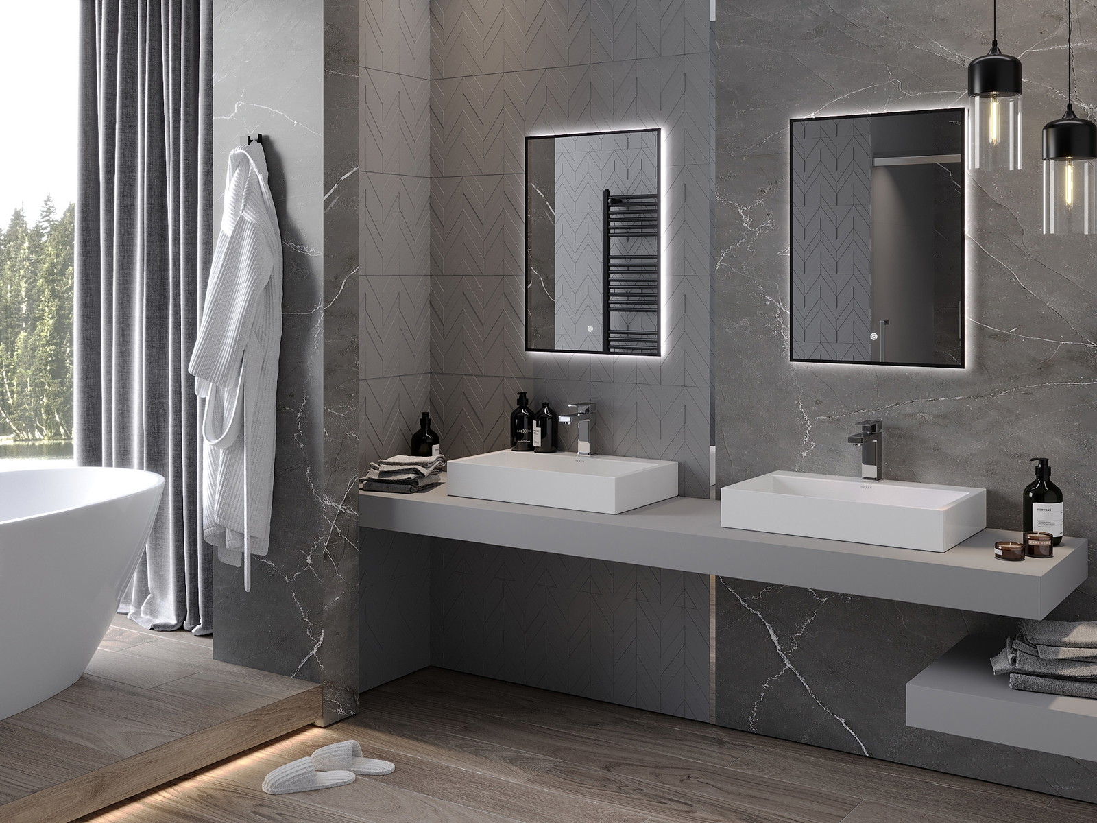 LED backlighting at the mirror is a practical element that makes daily grooming easier by providing the perfect illumination of the face. The backlighting gives the bathroom a modern finish, highlighting its elegant decor.
