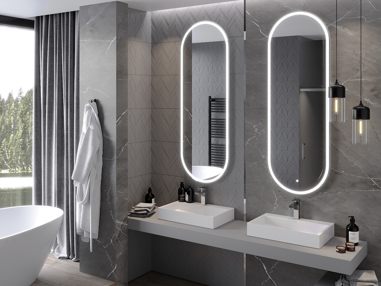 LED backlighting at the mirror is a practical element that makes daily grooming easier by providing the perfect illumination of the face. The backlighting gives the bathroom a modern finish, highlighting its elegant decor.