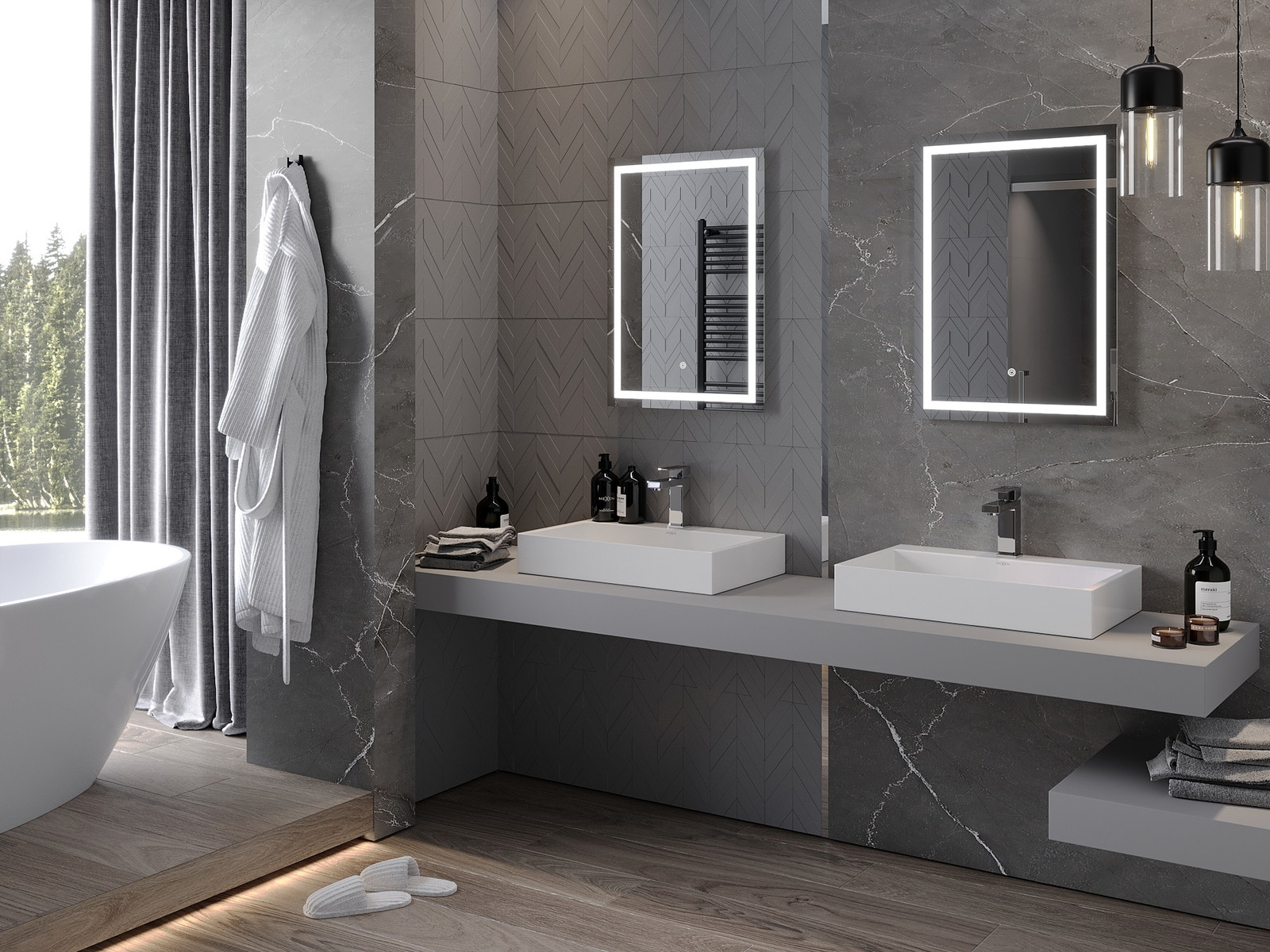 LED backlighting at the mirror is a practical element that makes daily grooming easier by providing the perfect illumination of the face. The backlighting gives the bathroom a modern finish, highlighting its elegant decor.