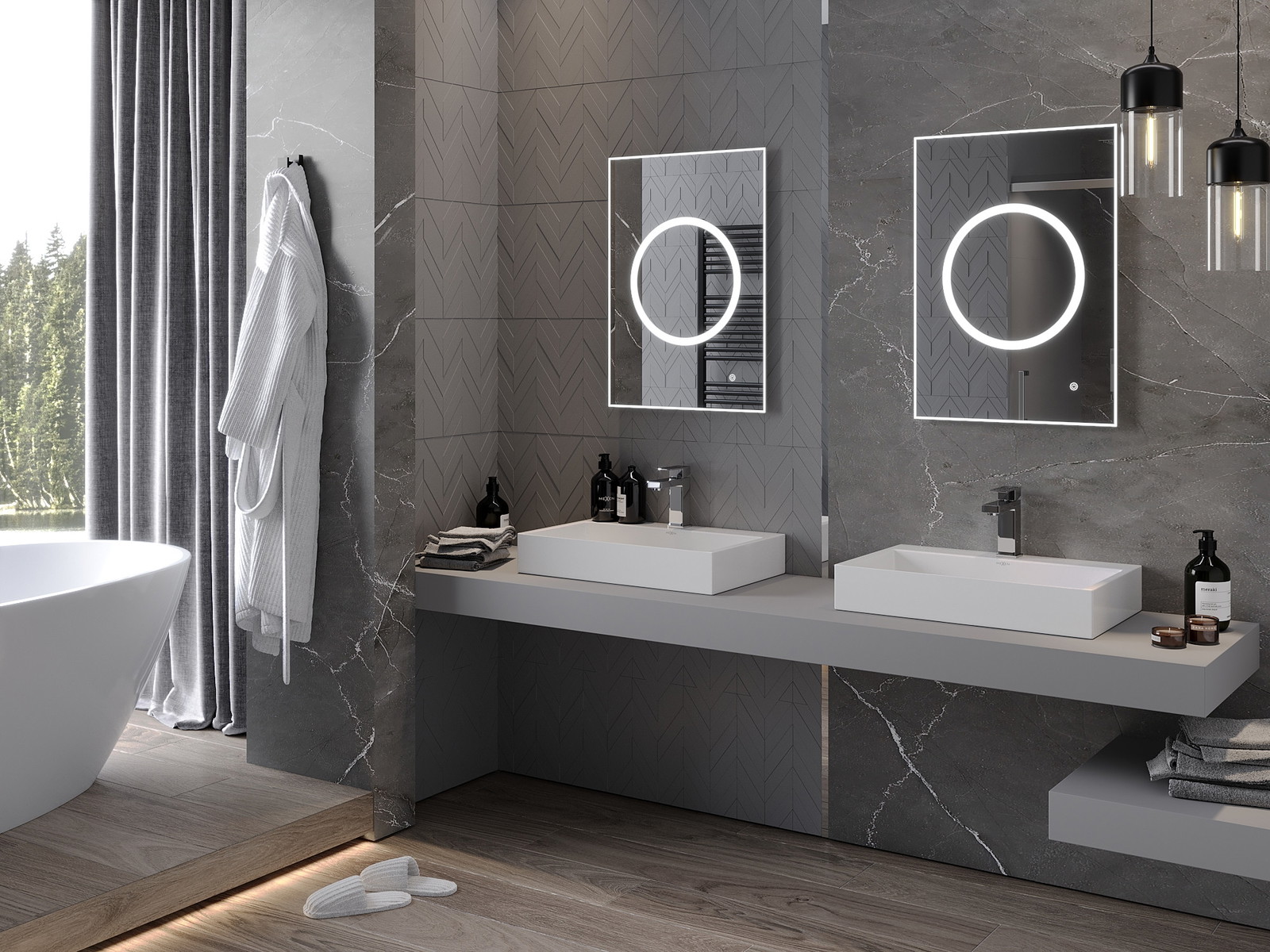 LED backlighting at the mirror is a practical element that makes daily grooming easier by providing the perfect illumination of the face. The backlighting gives the bathroom a modern finish, highlighting its elegant decor.