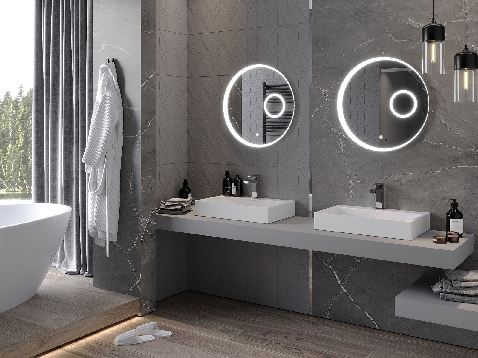 LED backlighting at the mirror is a practical element that makes daily grooming easier by providing the perfect illumination of the face. The backlighting gives the bathroom a modern finish, highlighting its elegant decor.