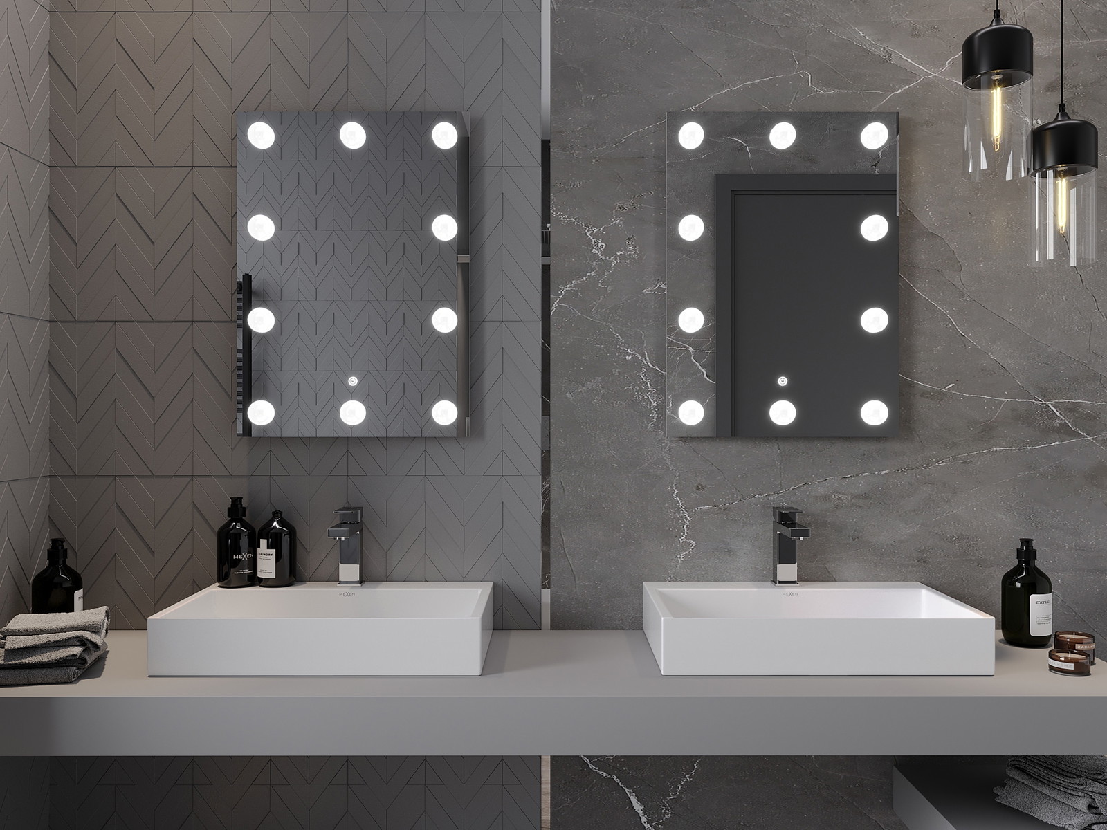 LED backlighting at the mirror is a practical element that makes daily grooming easier by providing the perfect illumination of the face. The backlighting gives the bathroom a modern finish, highlighting its elegant decor.