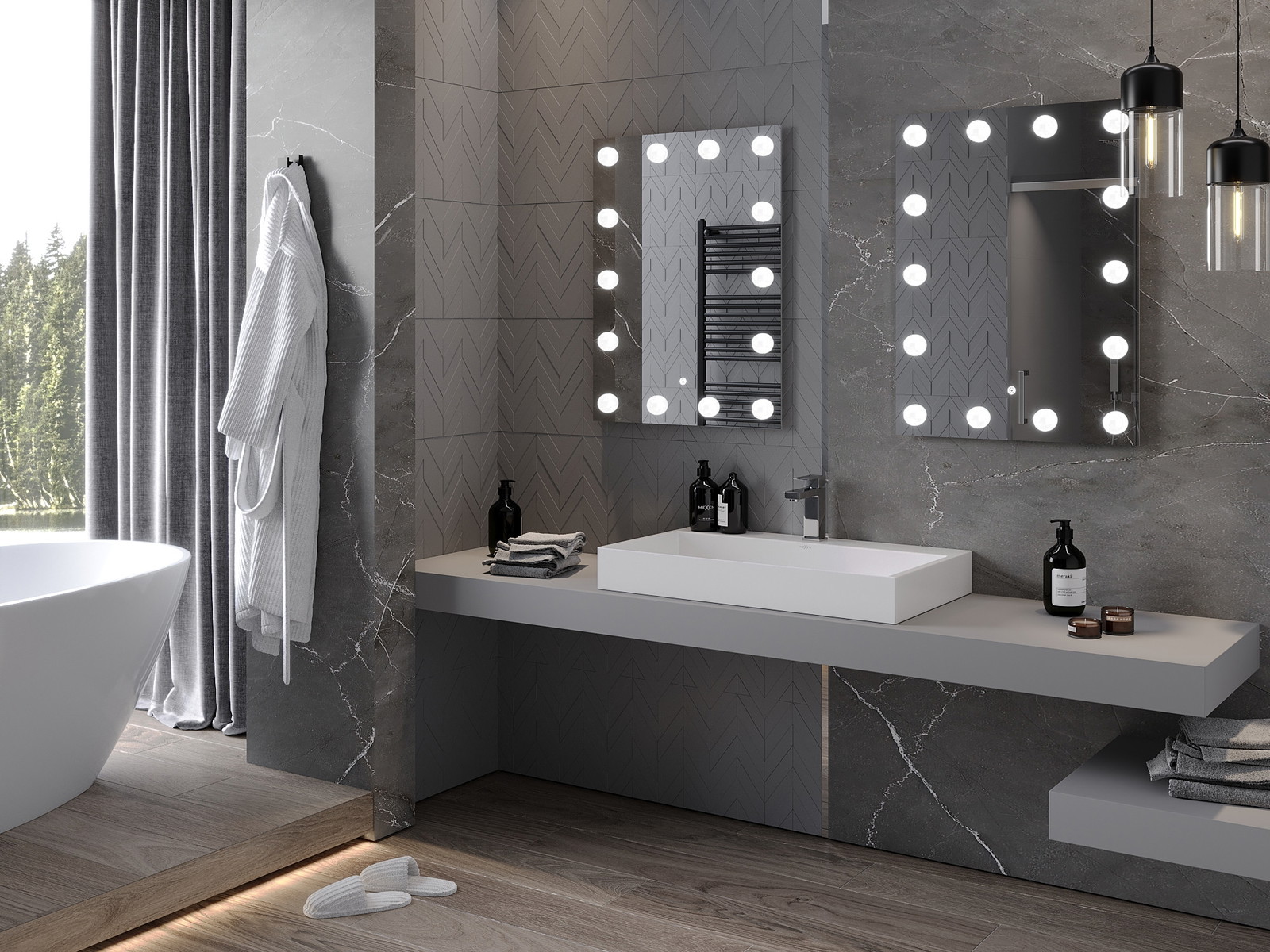 LED backlighting at the mirror is a practical element that makes daily grooming easier by providing the perfect illumination of the face. The backlighting gives the bathroom a modern finish, highlighting its elegant decor.