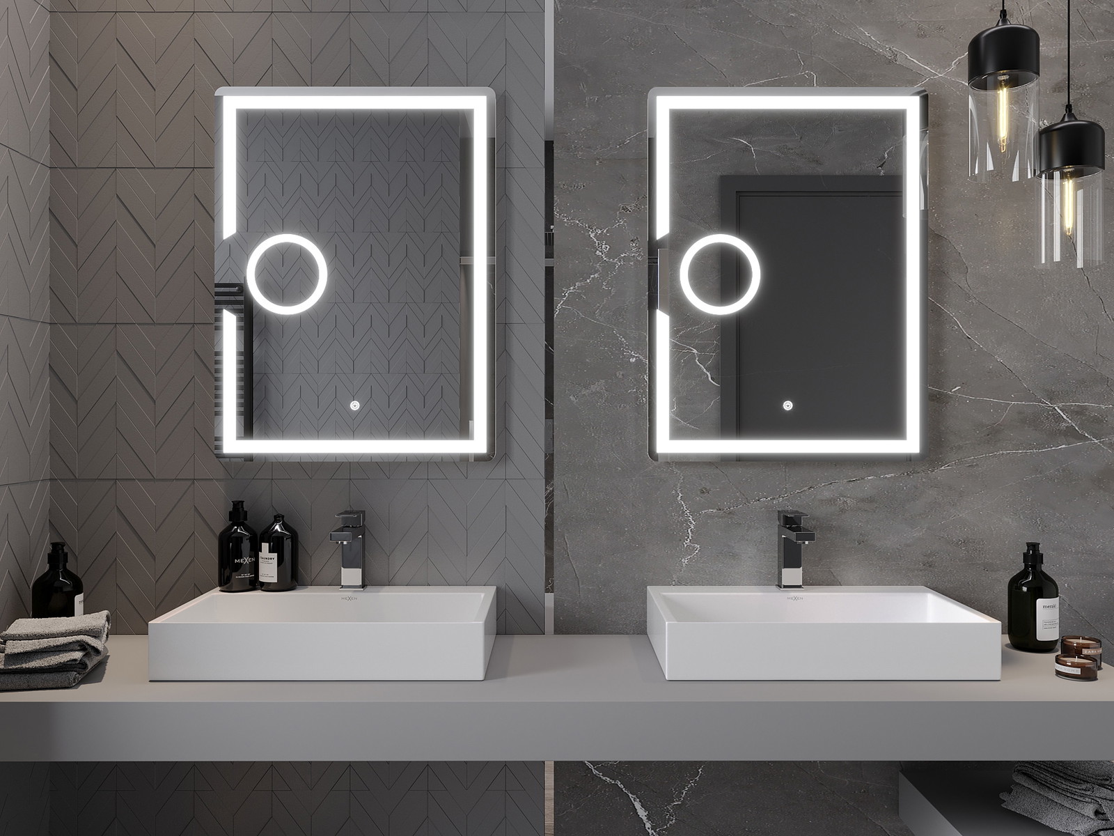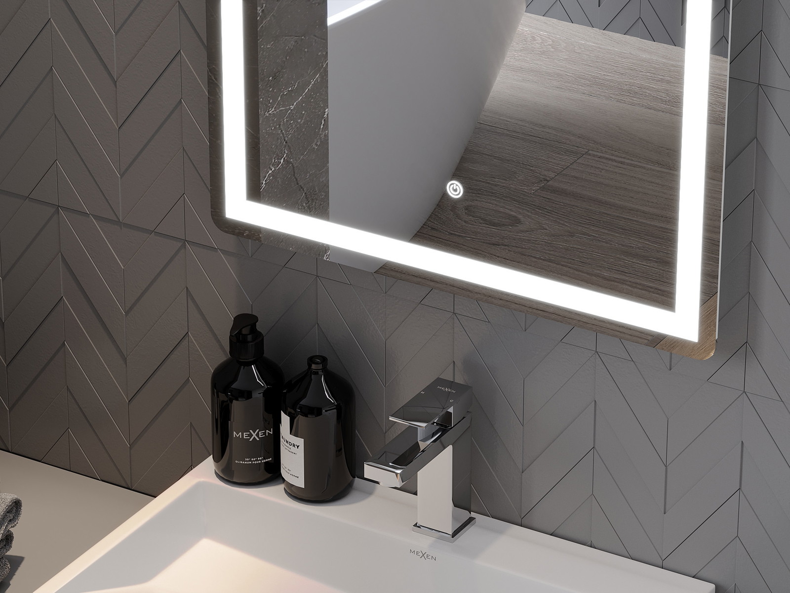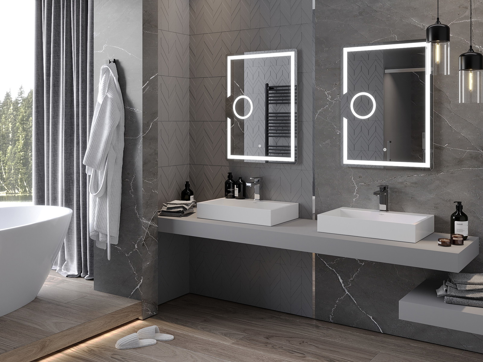 LED backlighting at the mirror is a practical element that makes daily grooming easier by providing the perfect illumination of the face. The backlighting gives the bathroom a modern finish, highlighting its elegant decor.