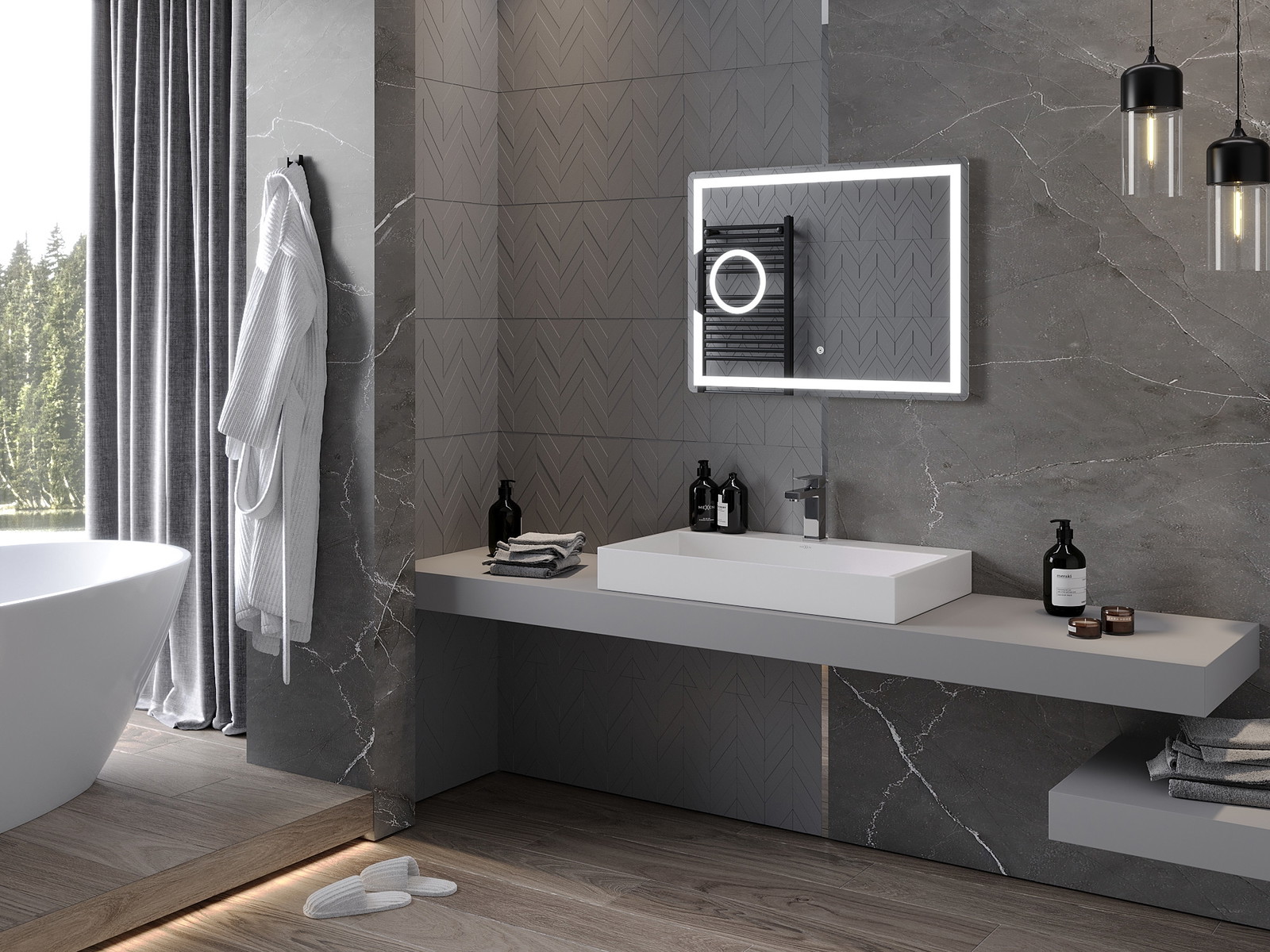 LED backlighting at the mirror is a practical element that makes daily grooming easier by providing the perfect illumination of the face. The backlighting gives the bathroom a modern finish, highlighting its elegant decor.