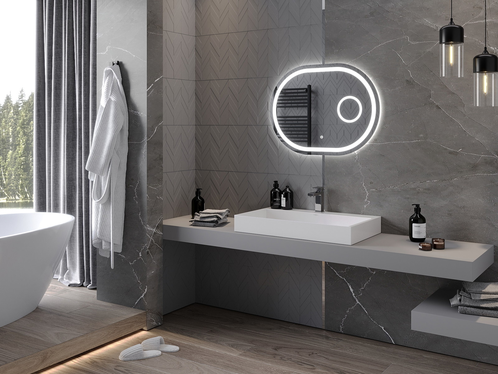 LED backlighting at the mirror is a practical element that makes daily grooming easier by providing the perfect illumination of the face. The backlighting gives the bathroom a modern finish, highlighting its elegant decor.
