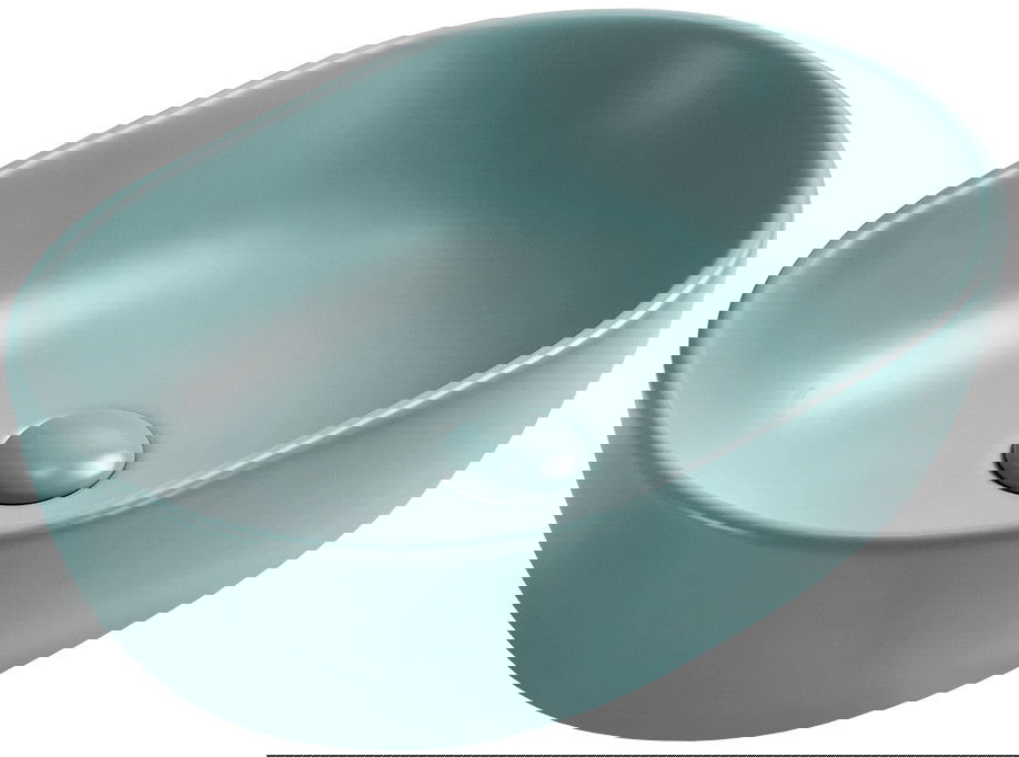 This countertop washbasin, with dimensions 48 x 35 cm in a light green matte finish, fits perfectly in modern interiors. Made from high-quality sanitary ceramics, it features a protective coating for durability and easy cleaning. The absence of an overflow and tap hole makes it an ideal choice for designer bathrooms. Its oval shape and low height of 14 cm add lightness and elegance, making it both functional and stylish.