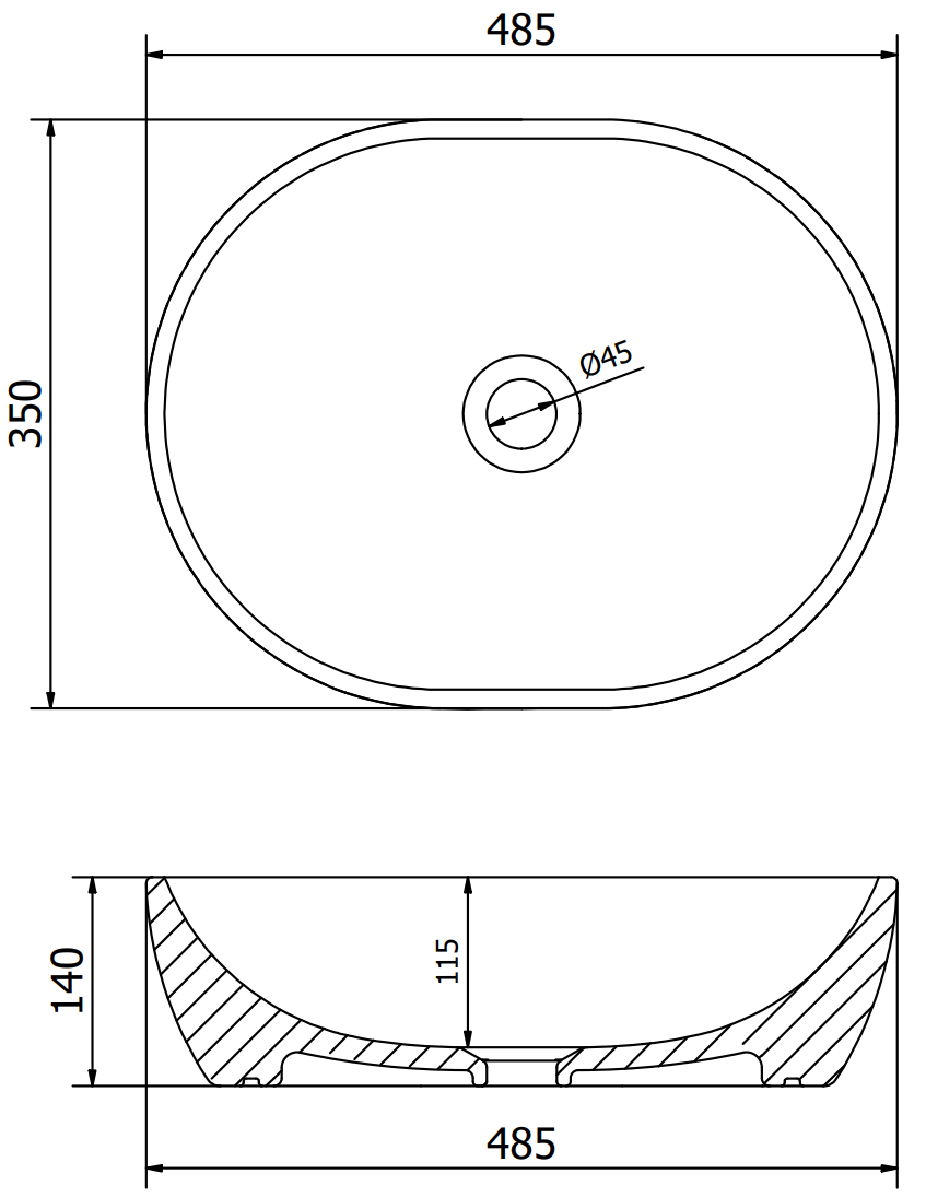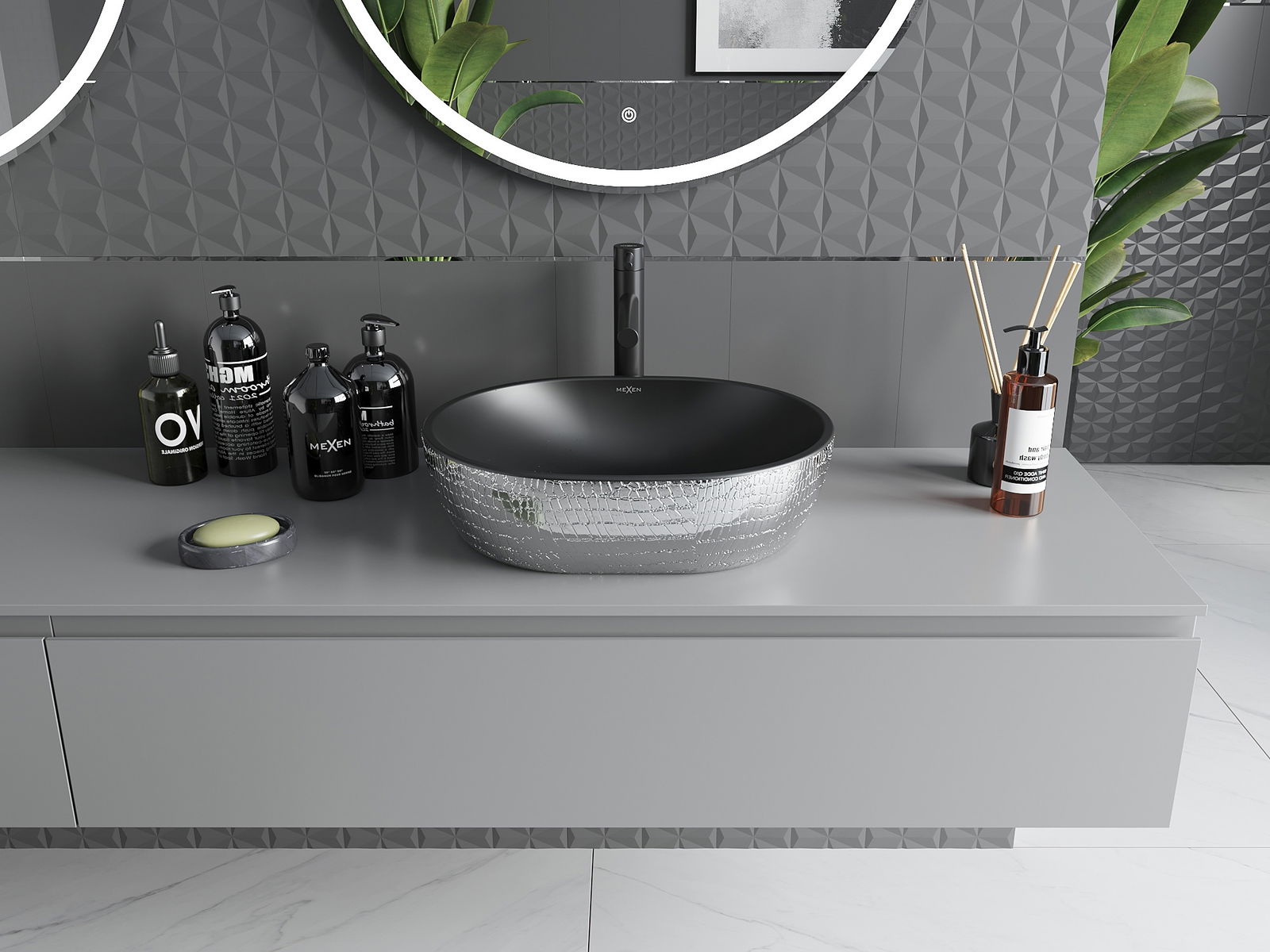 The Viki countertop basin is the perfect combination of elegance and functionality. It offers a modern design in matte black with a silver scale pattern. Made of durable sanitary ceramic, it provides resistance to damage. Its oval shape and dimensions of 48 x 35 x 14 cm make it a perfect fit for any bathroom. Thanks to its glossy surface, it not only looks beautiful but is also easy to keep clean. The absence of tap and overflow holes adds to its minimalist character.