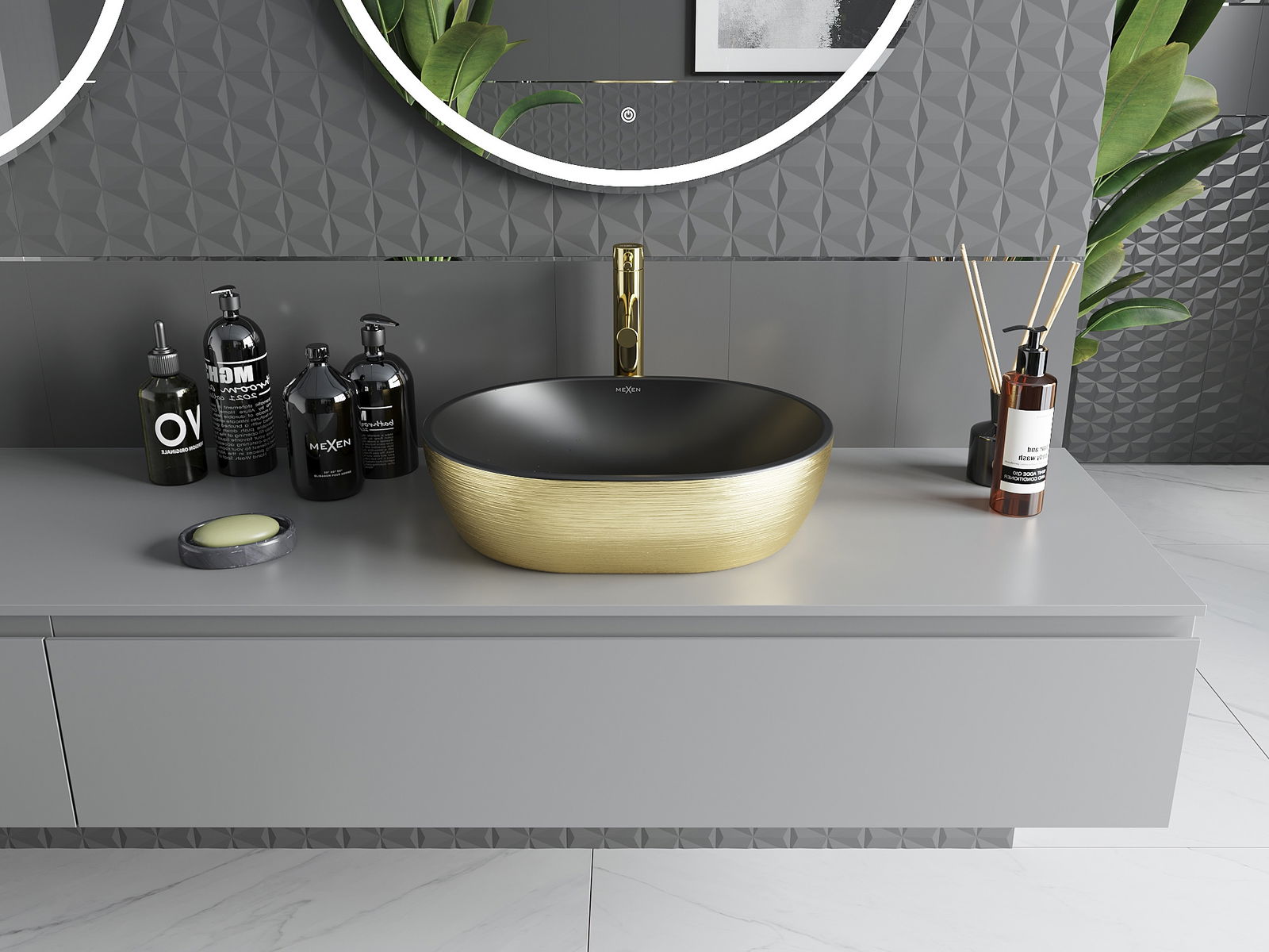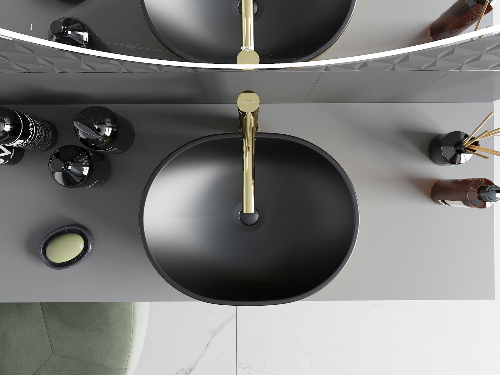 The countertop washbasin is the perfect solution for modern interiors. With dimensions of 48x35 cm and a depth of 11.5 cm, it will work perfectly in any bathroom. Its elegant black matte surface with a gold linear pattern is a combination of style and functionality. Made of high-quality sanitary ceramics, the washbasin is not only aesthetic but also durable. Without holes for taps and overflow, it presents a minimalist design that will emphasise the character of your space.