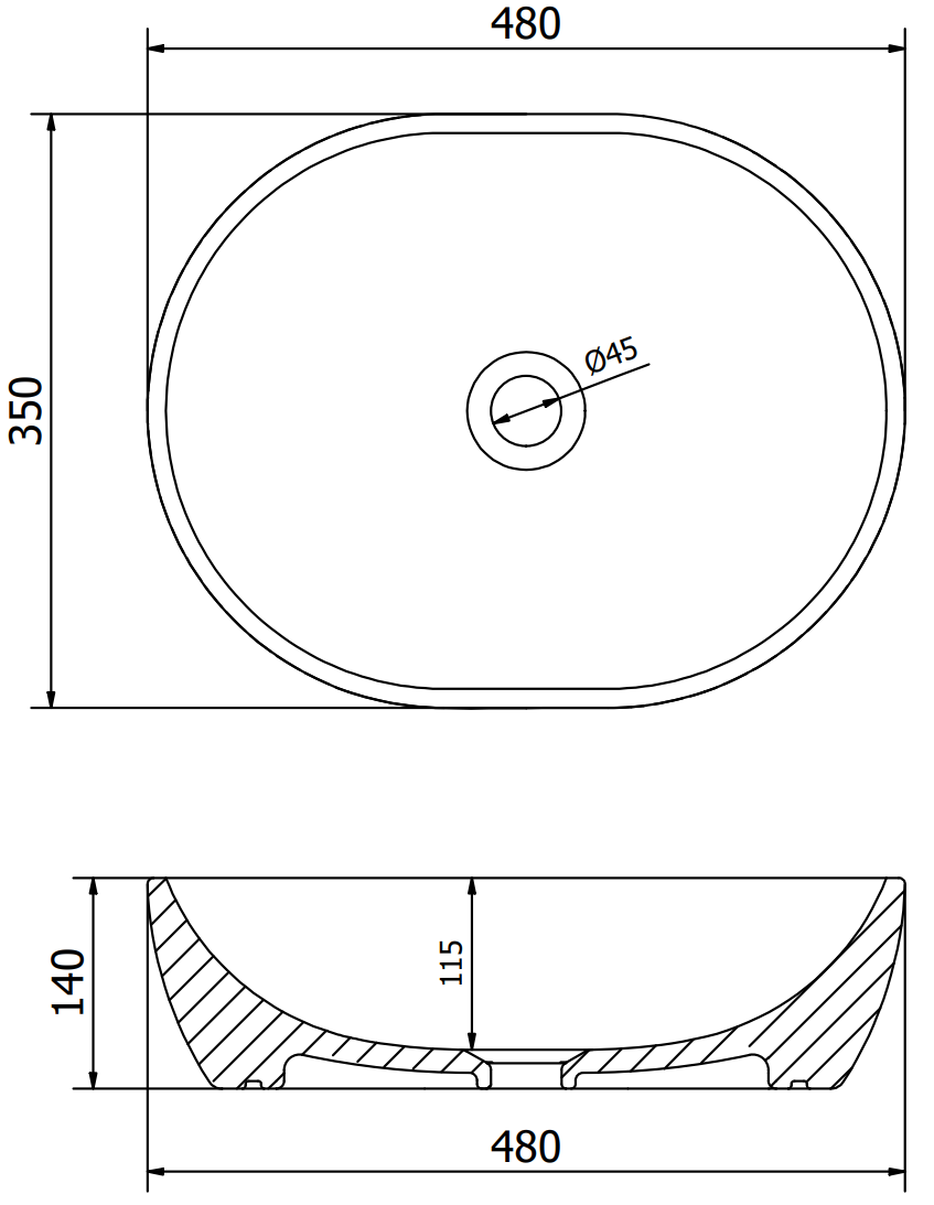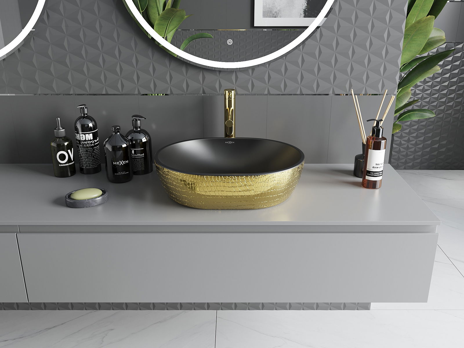 The Mexen Viki countertop washbasin is an ideal solution for modern bathrooms. Its oval shape and elegant black matte with a golden scale pattern bring style and luxury. Dimensions 48x35x14 cm and a depth of 11.5 cm ensure comfort of use. The product is made of high-quality sanitary ceramic with a polished surface, making it easy to maintain cleanliness. Additionally, the washbasin does not have an overflow hole or a tap hole, allowing for more minimalist arrangements.