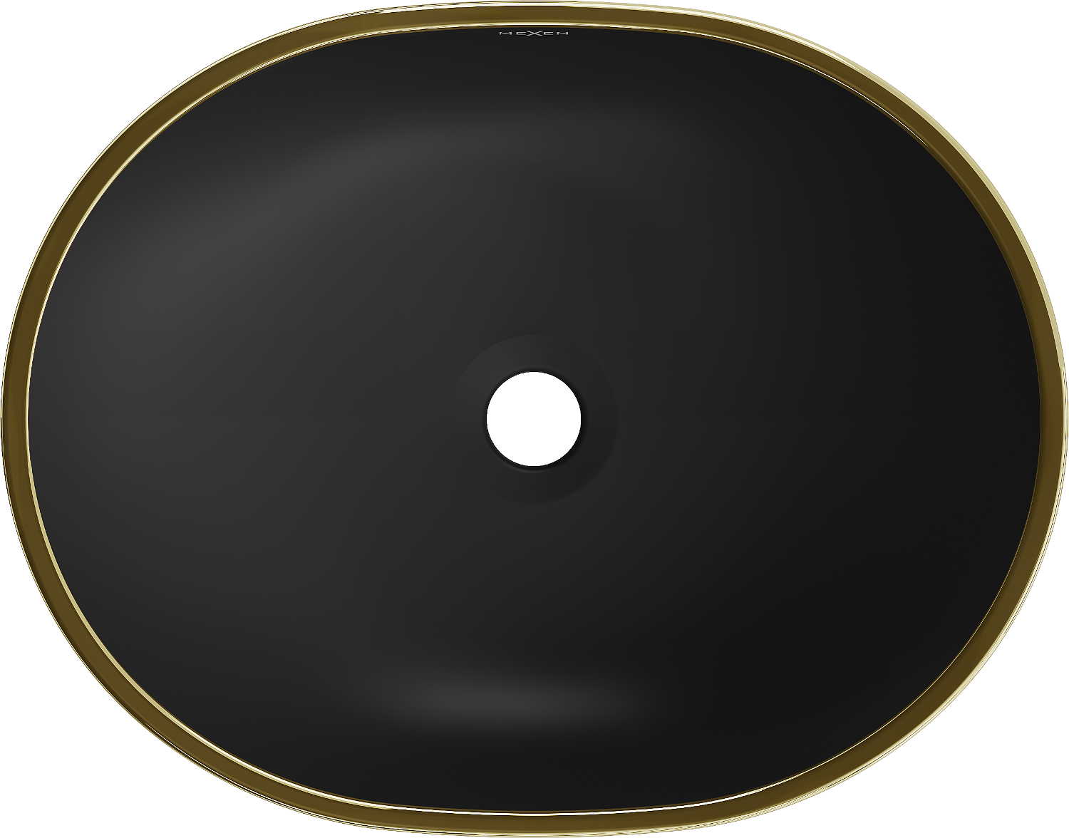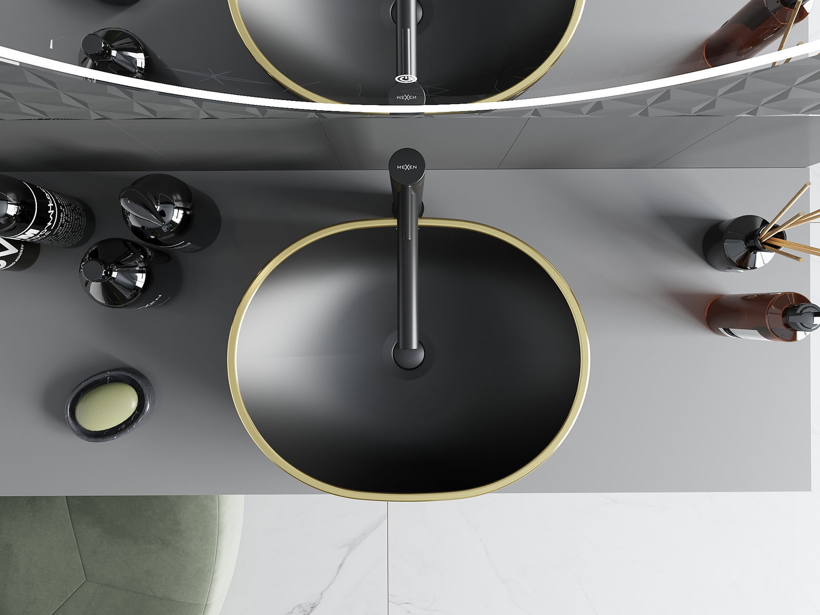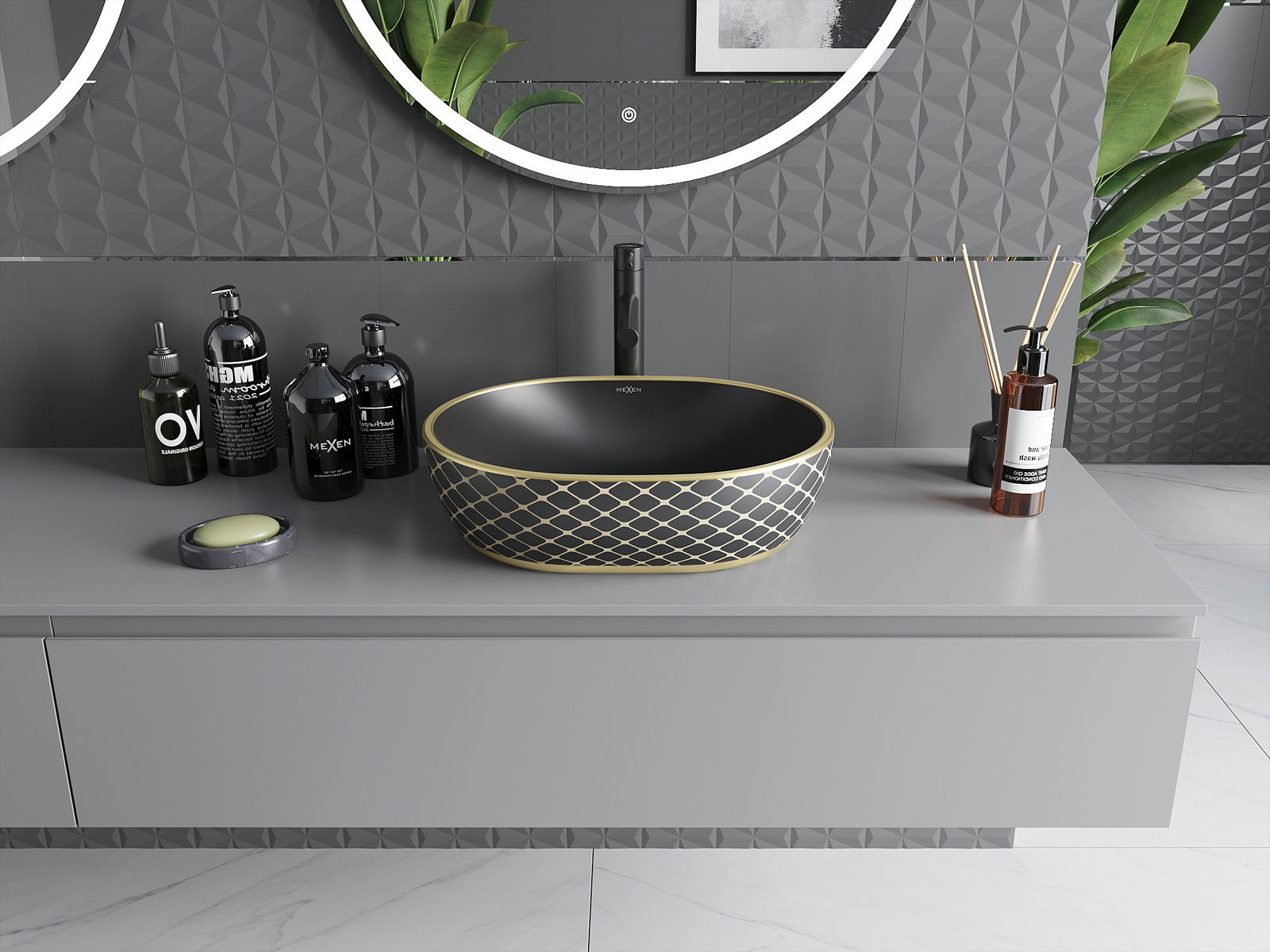 Mexen Viki is an elegant countertop washbasin measuring 48 x 35 cm, made of high-quality sanitary ceramic. Its matte black surface with a golden grid pattern adds a modern touch to the interior. Thanks to its size suitable for various spaces, the washbasin offers comfort in use, and the lack of tap and overflow holes gives it a minimalist look. The protective coating ensures easy cleaning, making it a practical solution for any interior.