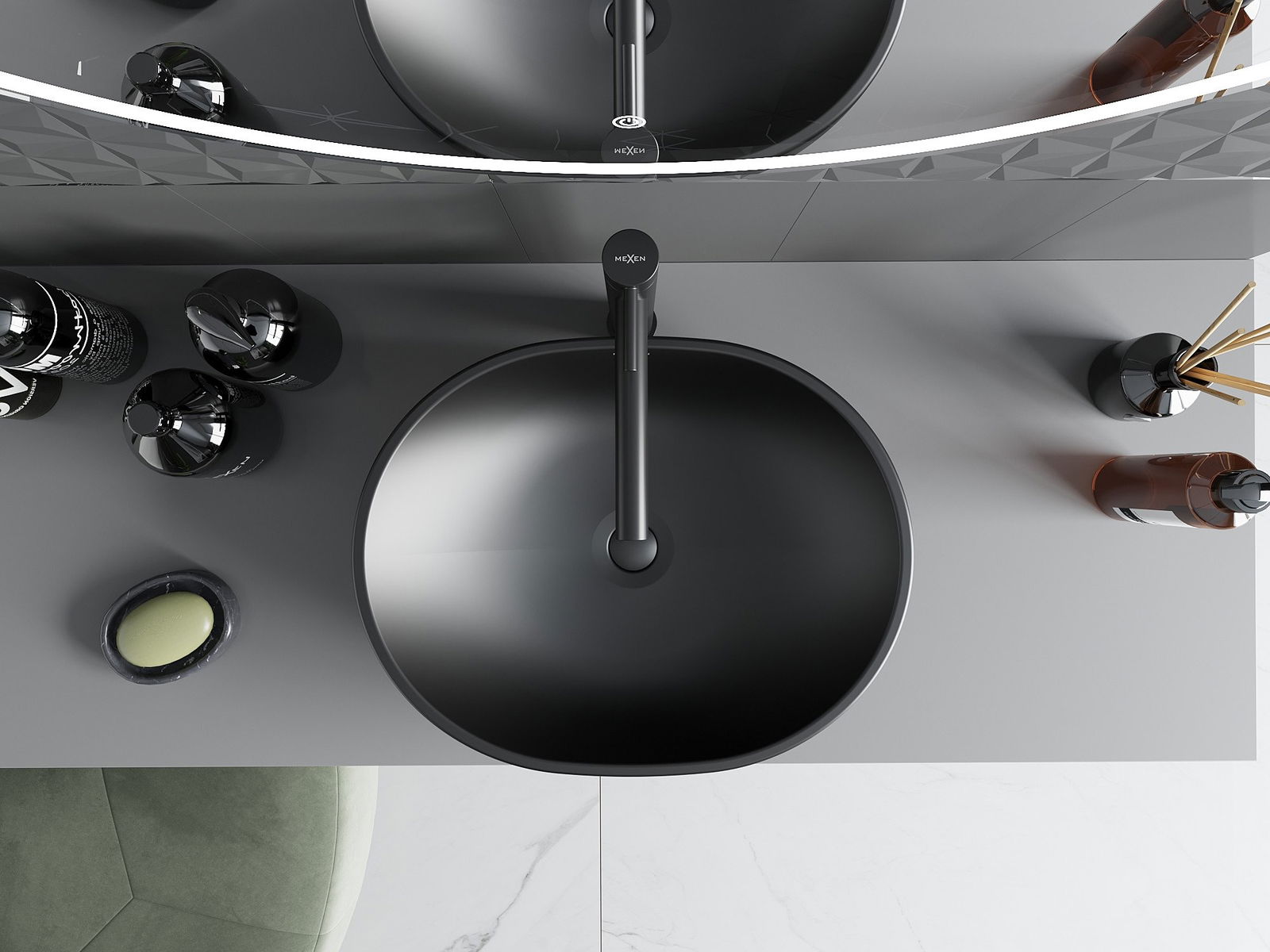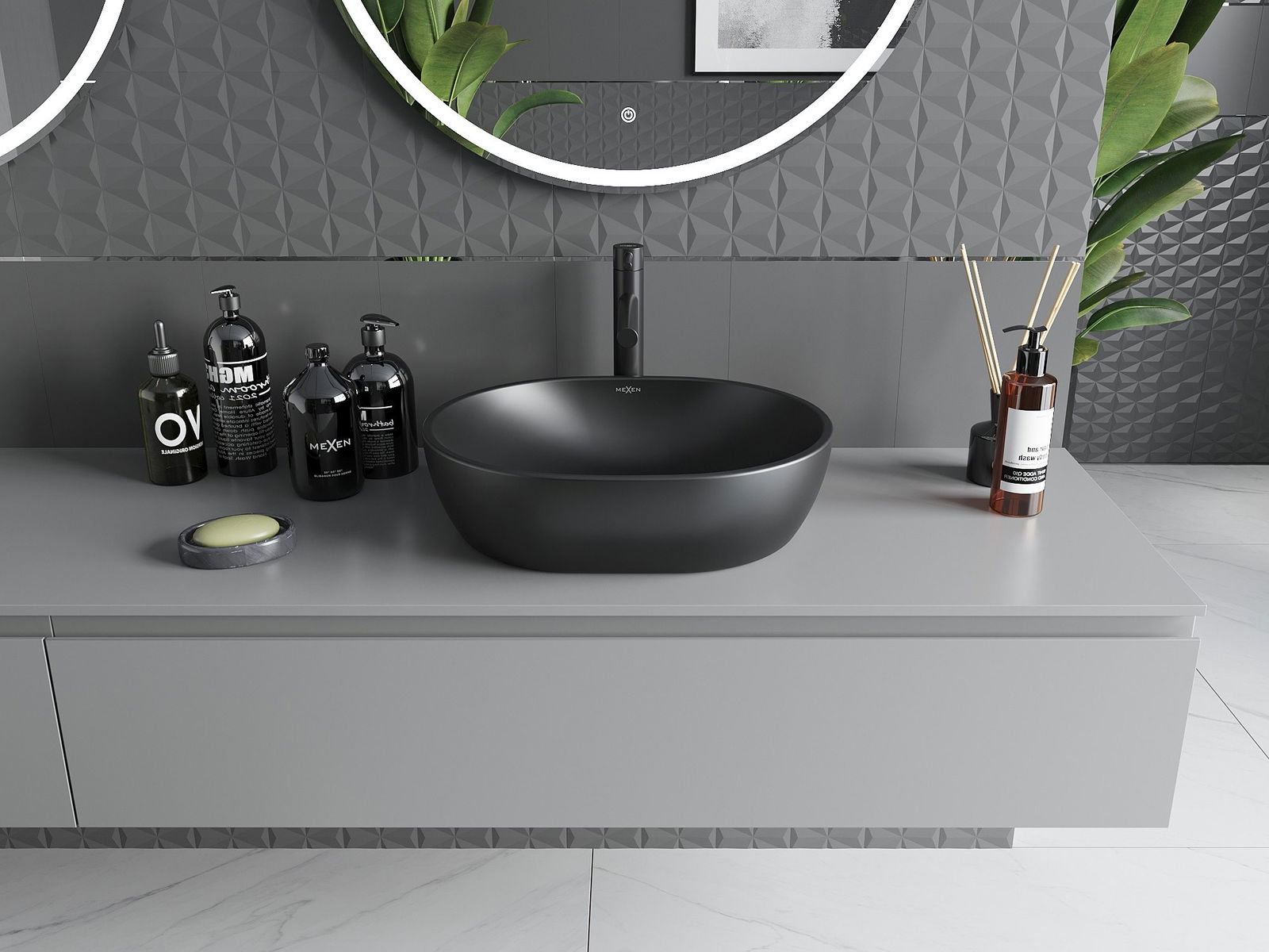 The Mexen Viki agreement is the ideal solution for modern bathrooms. The countertop washbasin with dimensions of 48.5 x 35 cm in an elegant matte black colour impresses with its oval shape and minimalist design. Made of high-quality sanitary ceramics, it ensures not only aesthetics but also durability. Its protective layer makes it easy to maintain cleanliness, and its small depth of 11.5 cm makes it perfect for small spaces. The lack of holes for taps allows for any arrangement.