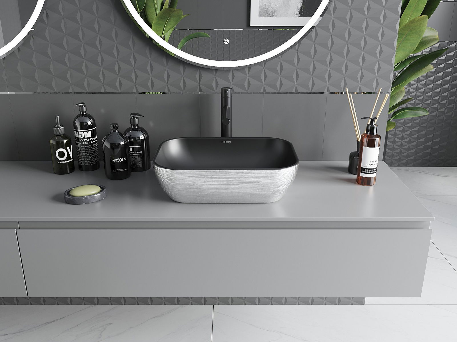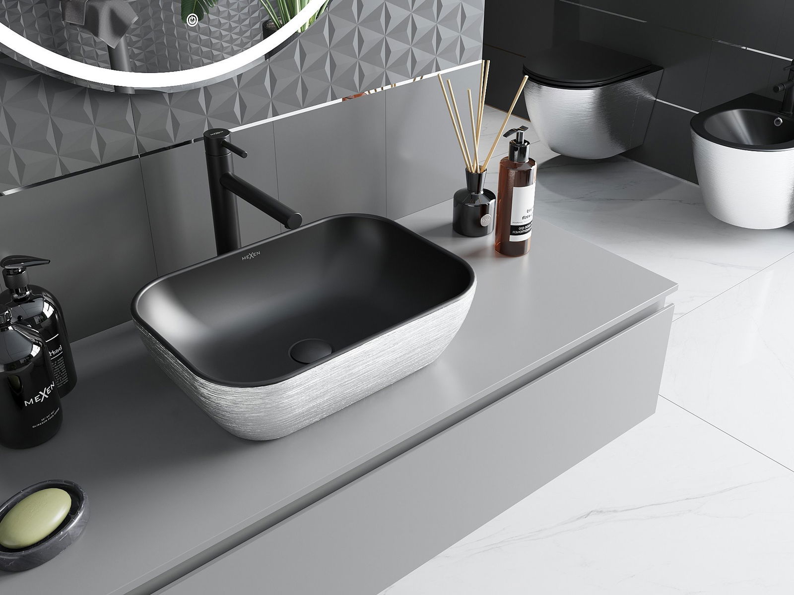 Mexen Rita countertop washbasin 45 x 32 cm, black matte/silver line pattern - 21084573