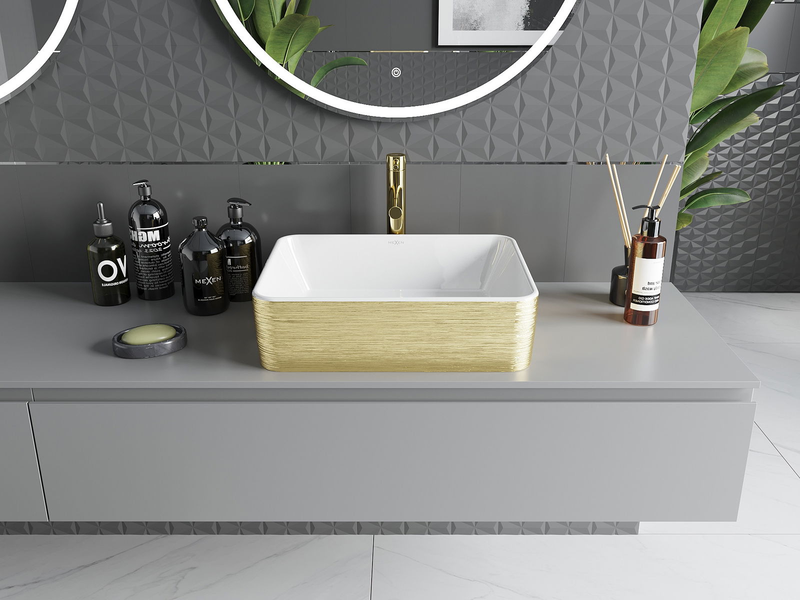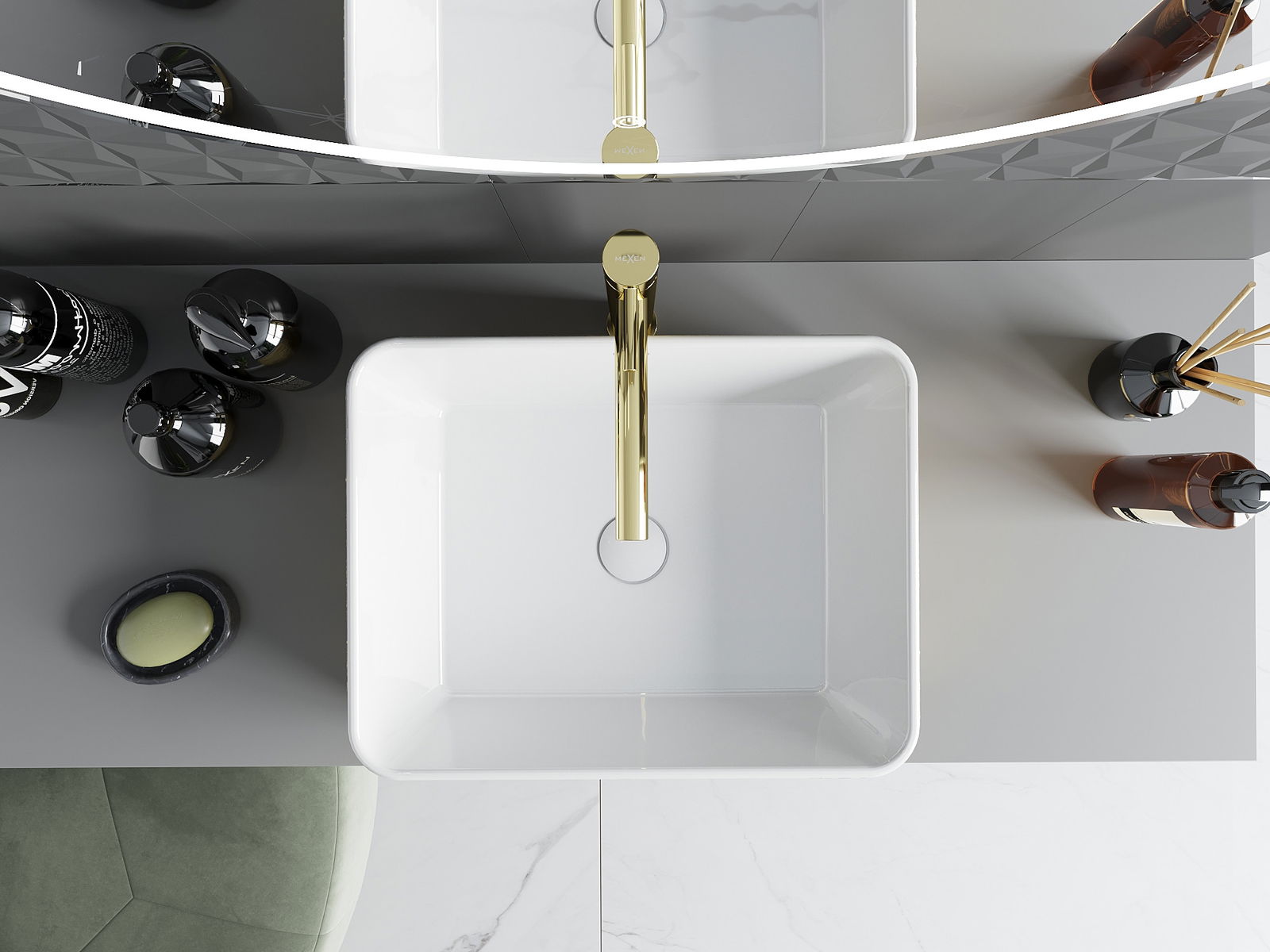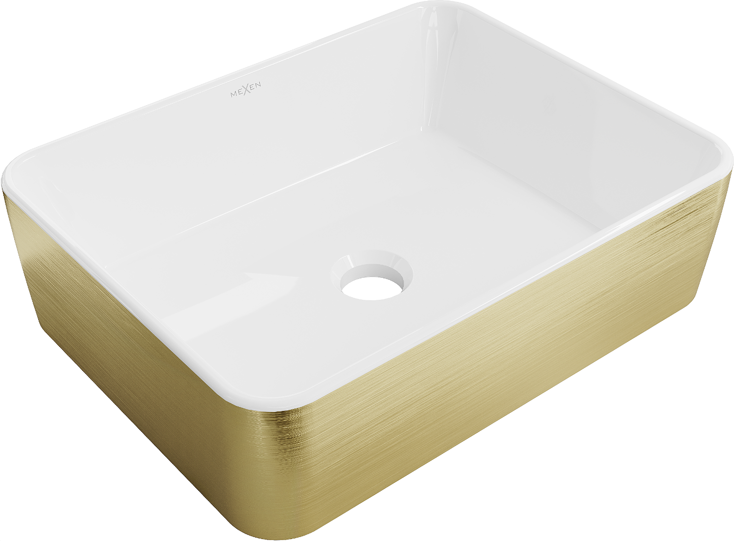 Mexen Catia is an elegant countertop washbasin measuring 48 x 38 cm in white and gold, perfect for modern bathrooms. Made of high-quality sanitary ceramic, it features a rectangular shape and matte finish, giving it a unique charm. The absence of tap and overflow holes ensures a minimalist design, while an additional protective layer enhances durability. Ideal for finishing interiors in a luxurious or Scandinavian style.