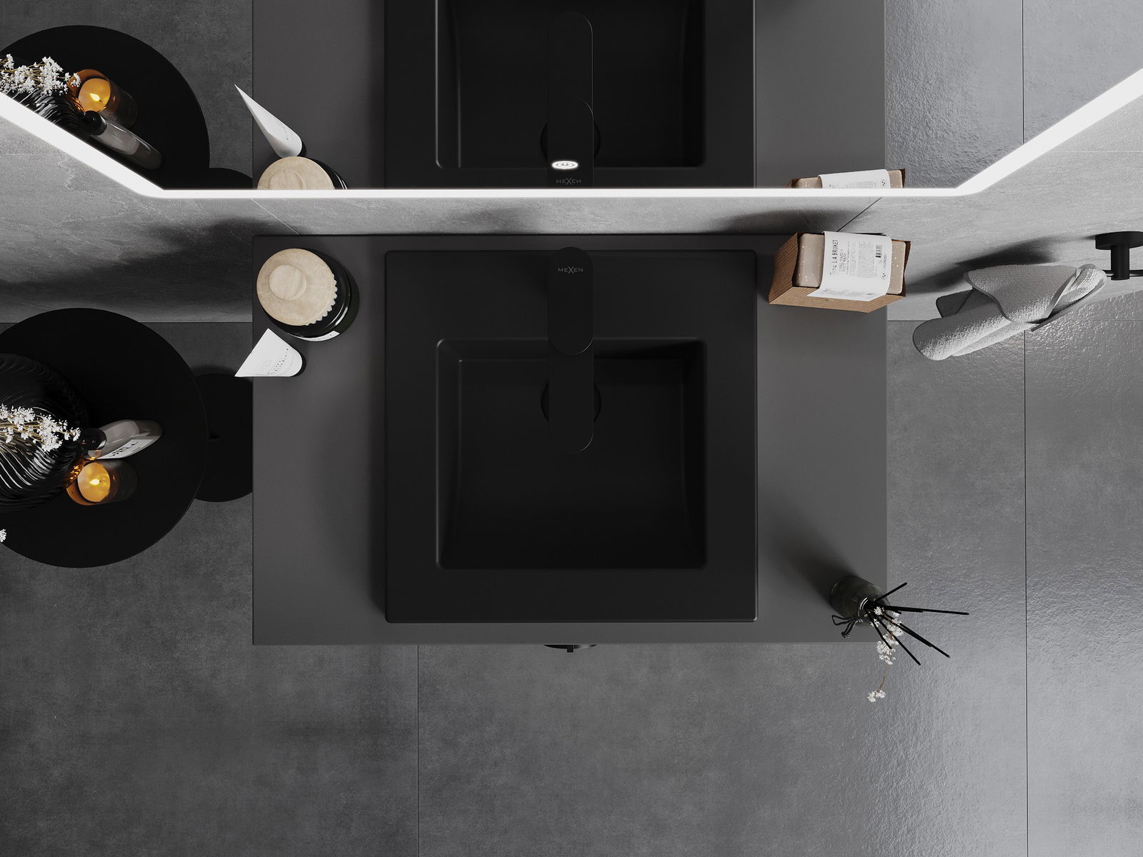 The sink has a hole in which we can mount the battery. This saves a valuable space in the bathroom and emphasize its aesthetics. This solution also allows you to easily keep clean around the sink.