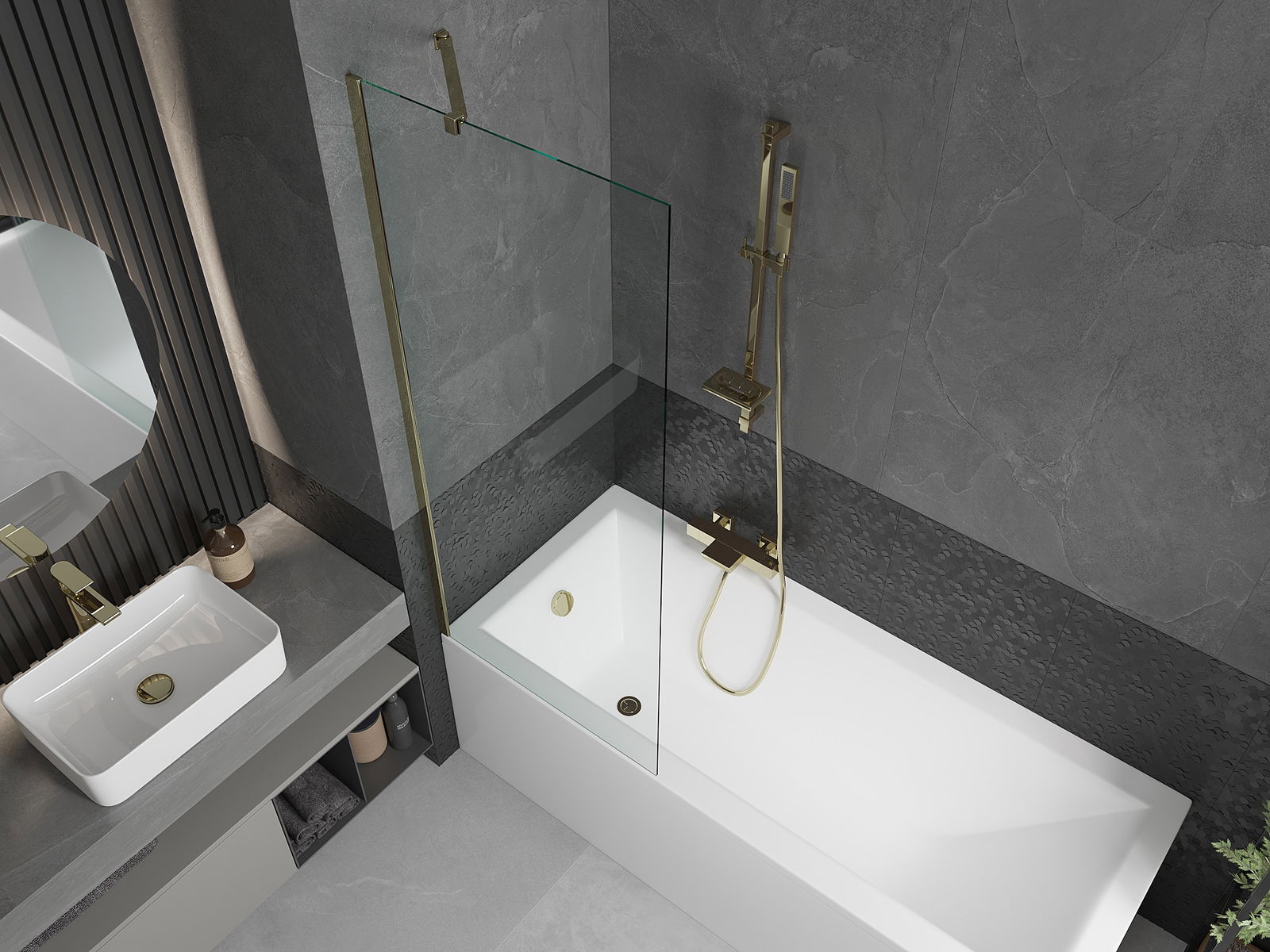 Mexen Cubik Rectangular Bathtub 160 x 70 cm with Cover and 1-Panel Screen 70 cm, Transparent, Gold - 550316070X9507000050