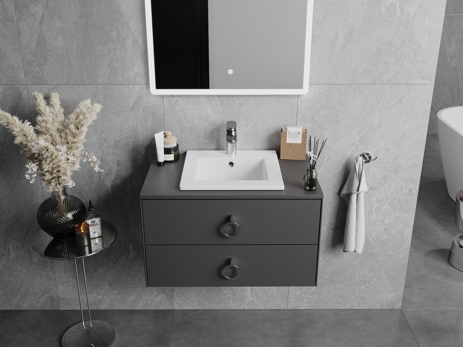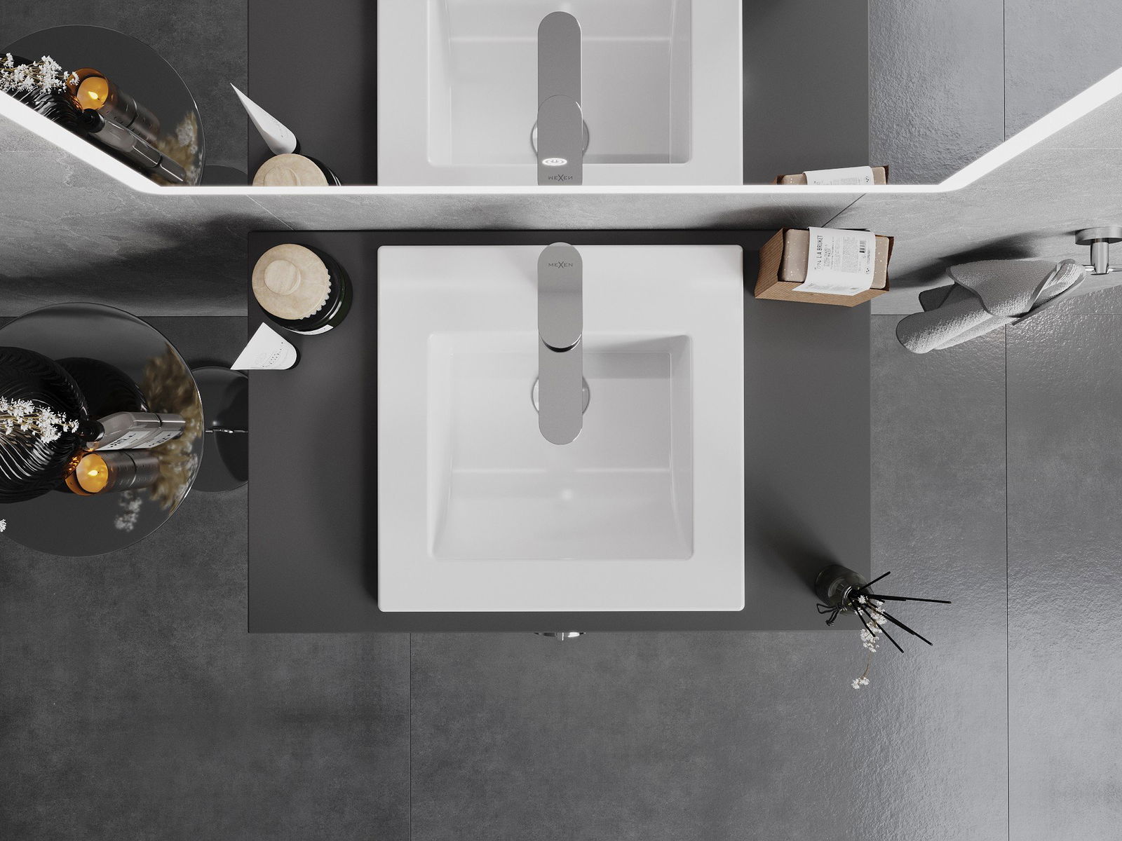 The sink has a hole in which we can mount the battery. This saves a valuable space in the bathroom and emphasize its aesthetics. This solution also allows you to easily keep clean around the sink.