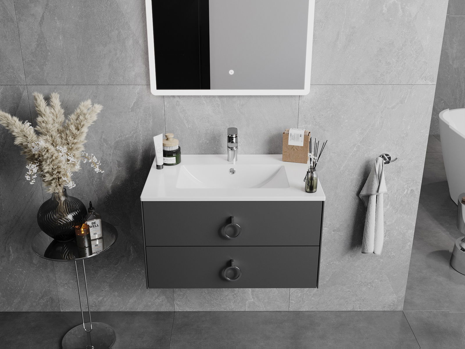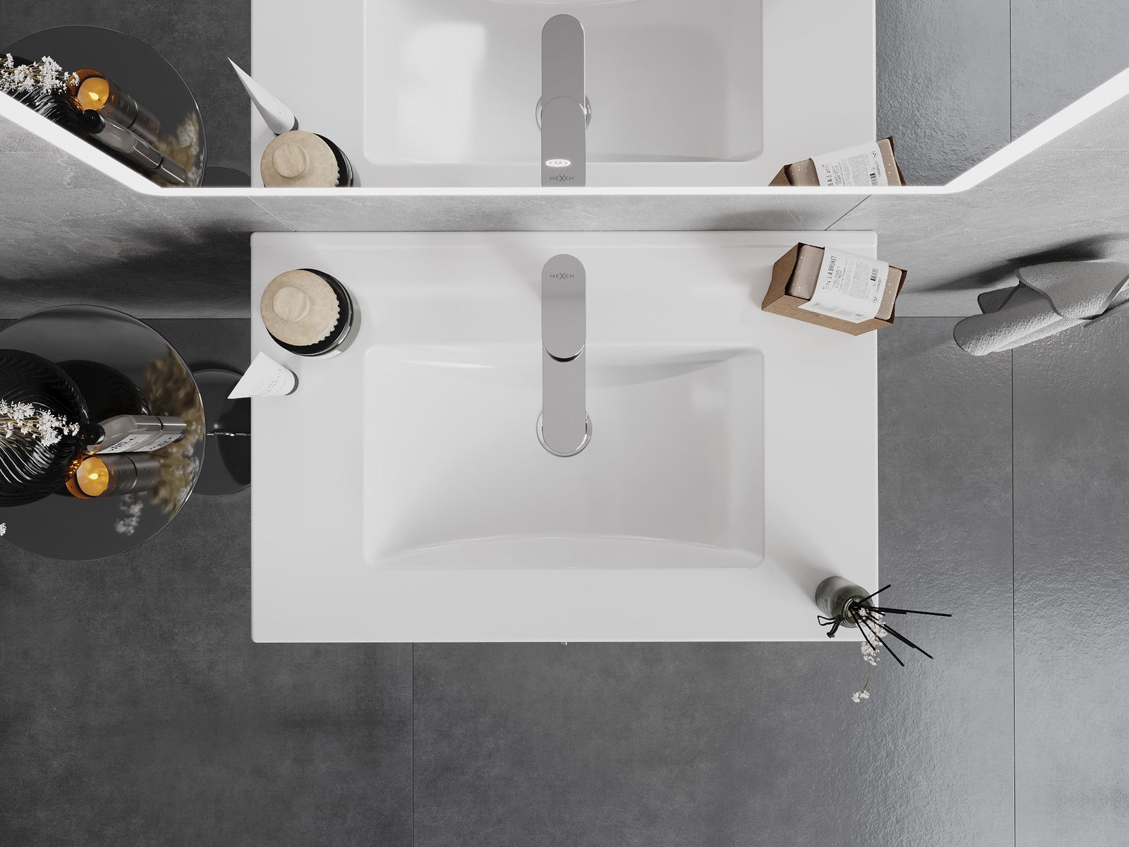 The sink has a hole in which we can mount the battery. This saves a valuable space in the bathroom and emphasize its aesthetics. This solution also allows you to easily keep clean around the sink.