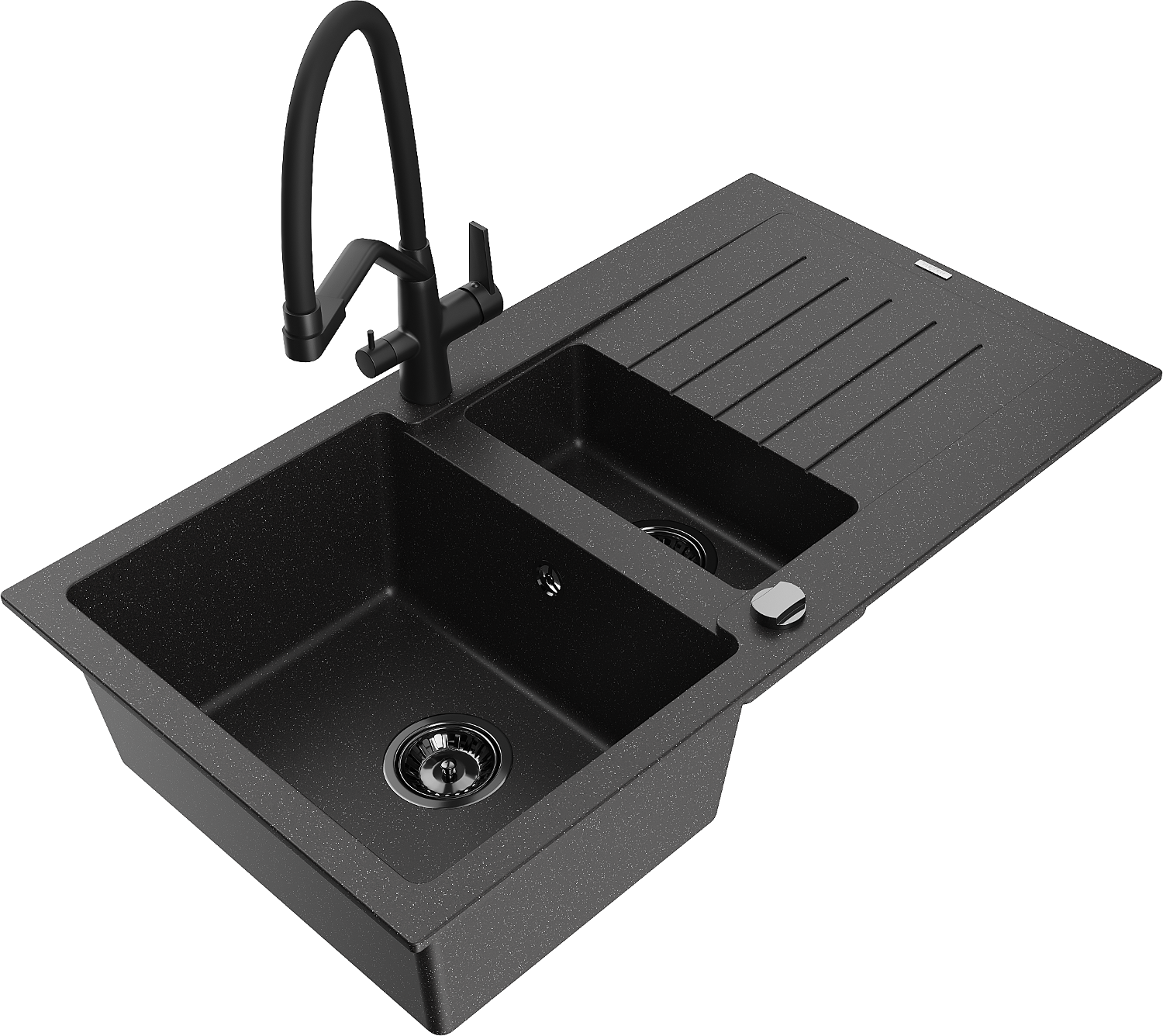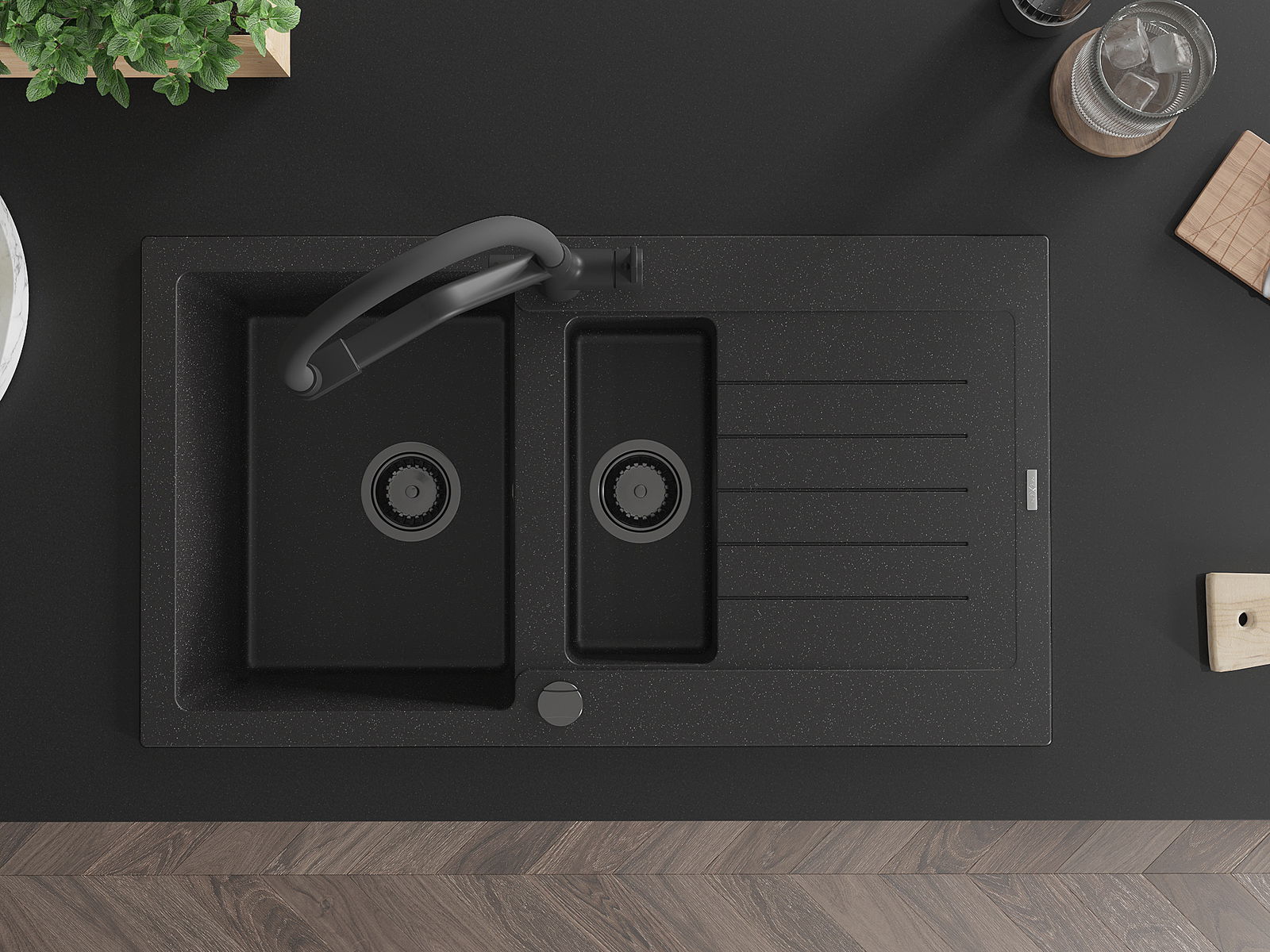 Mexen Matias 1.5-bowl granite sink with drainer and Duo kitchen tap, black/silver - 6502-73-671701-70-B