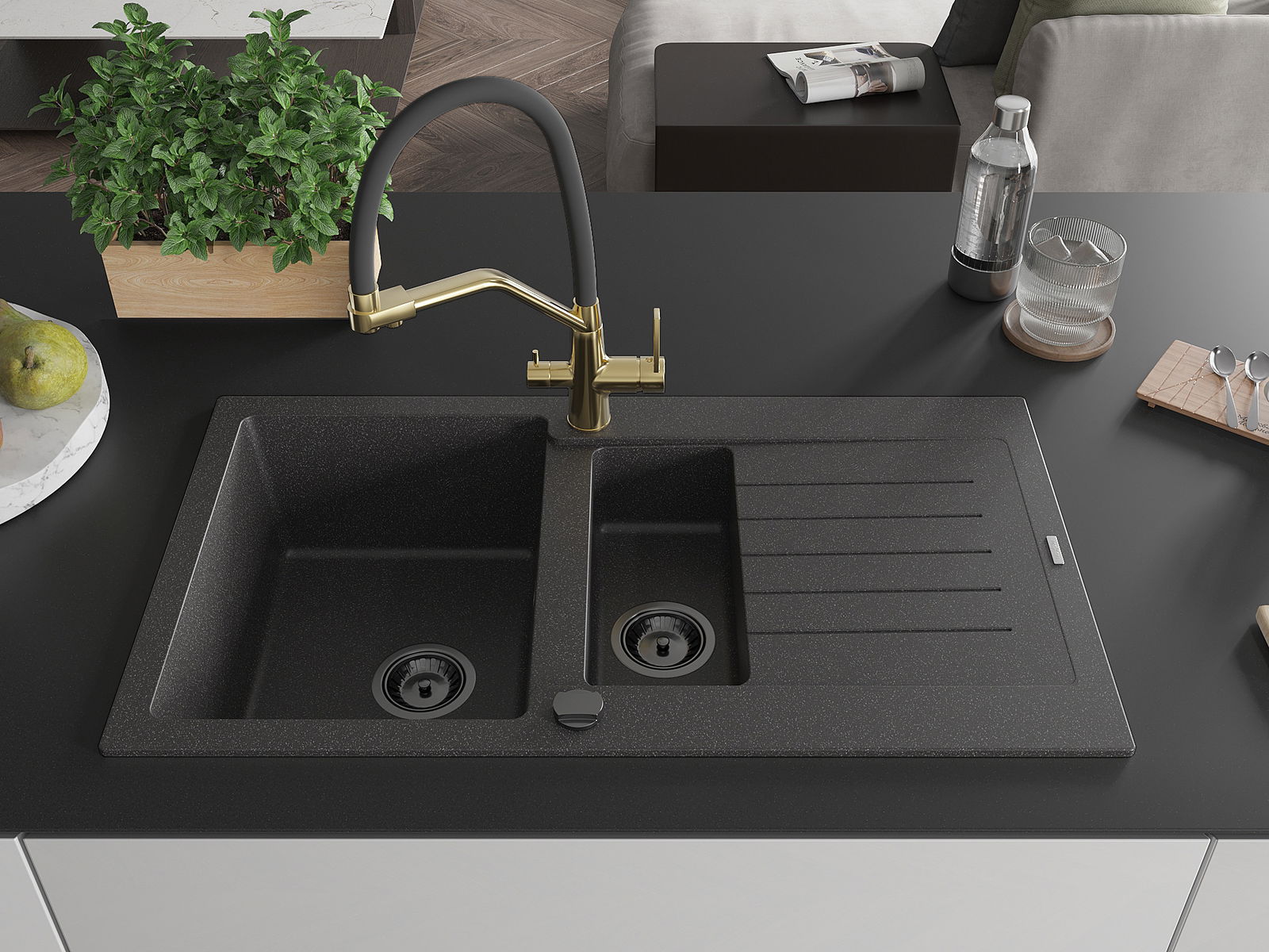 The sink is made of high quality granite. It is an elegant and, above all, practical complement to every kitchen, regardless of its style. High quality and granite durability ensure many years of use.