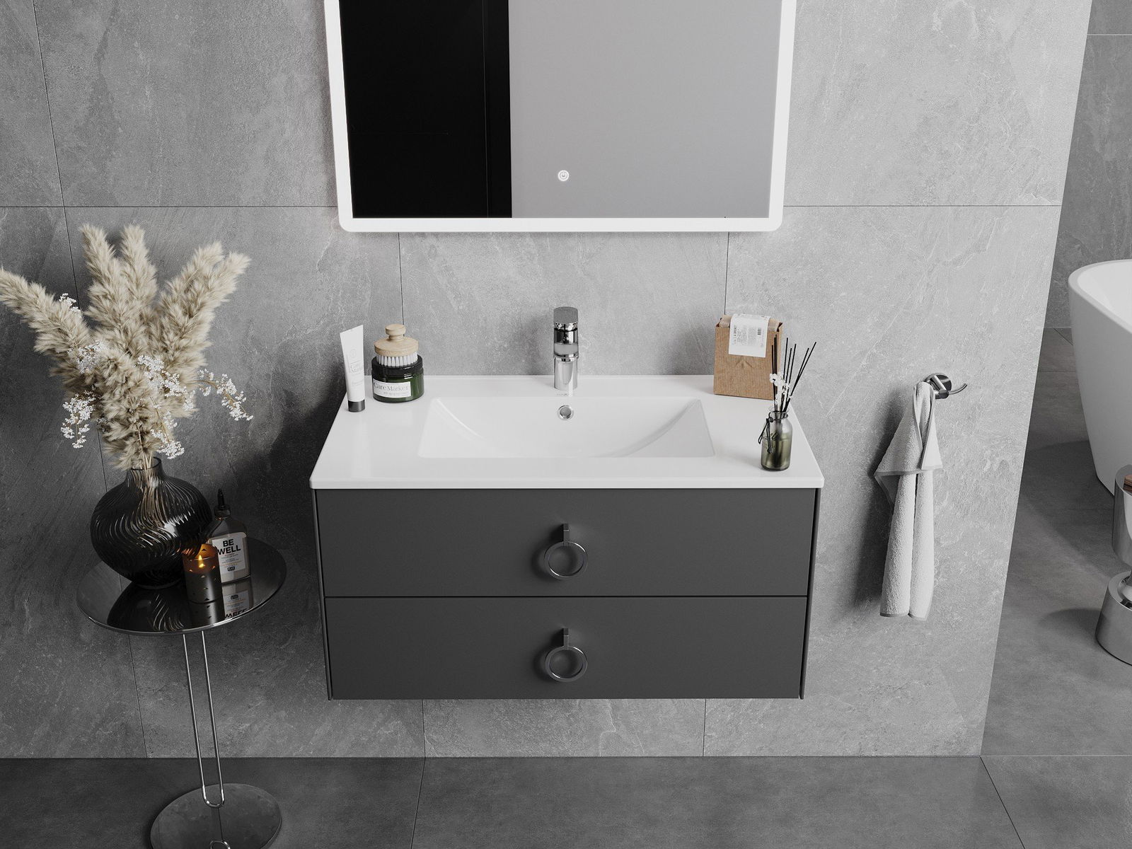 The sink has a hole in which we can mount the battery. This saves a valuable space in the bathroom and emphasize its aesthetics. This solution also allows you to easily keep clean around the sink.