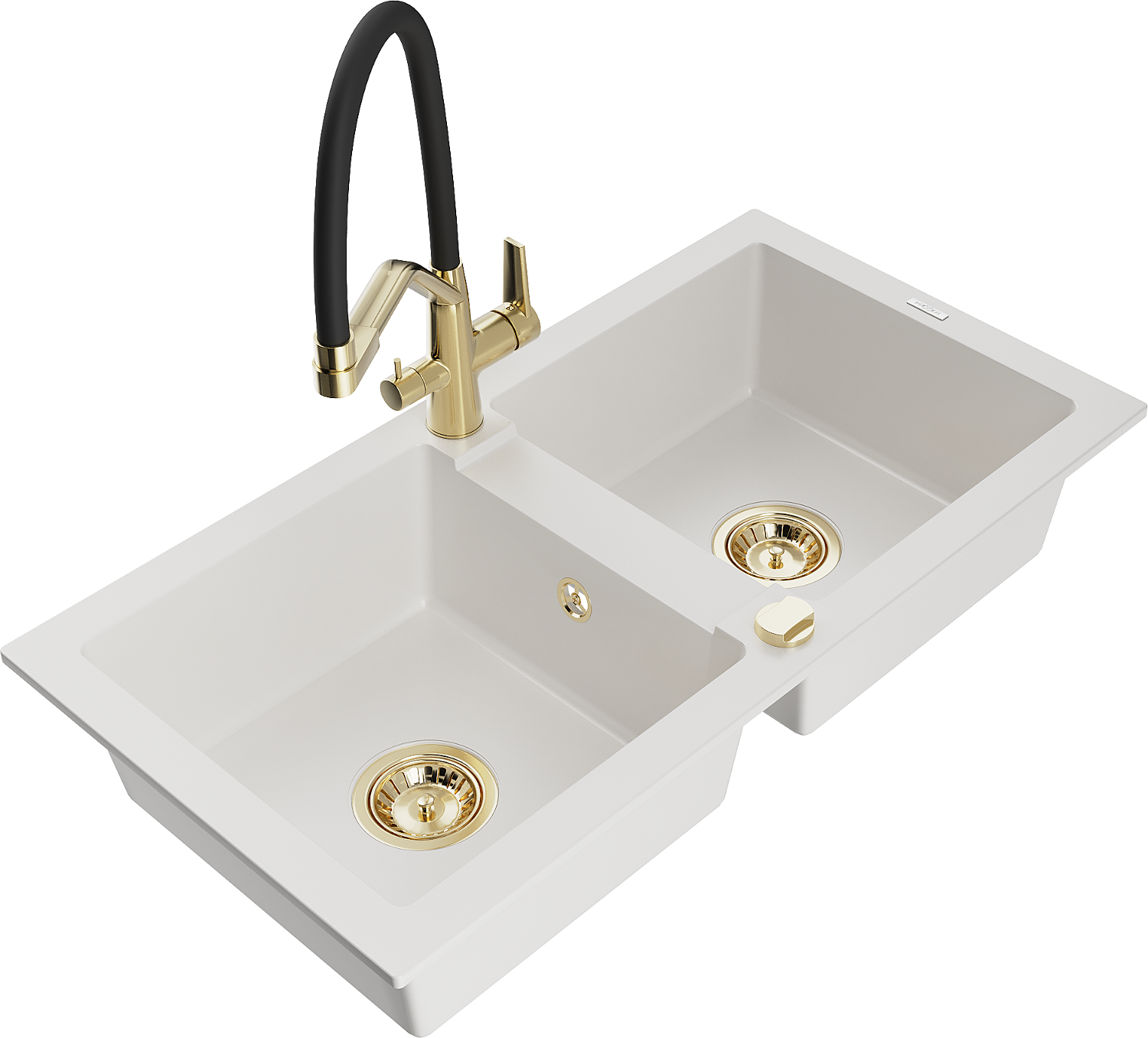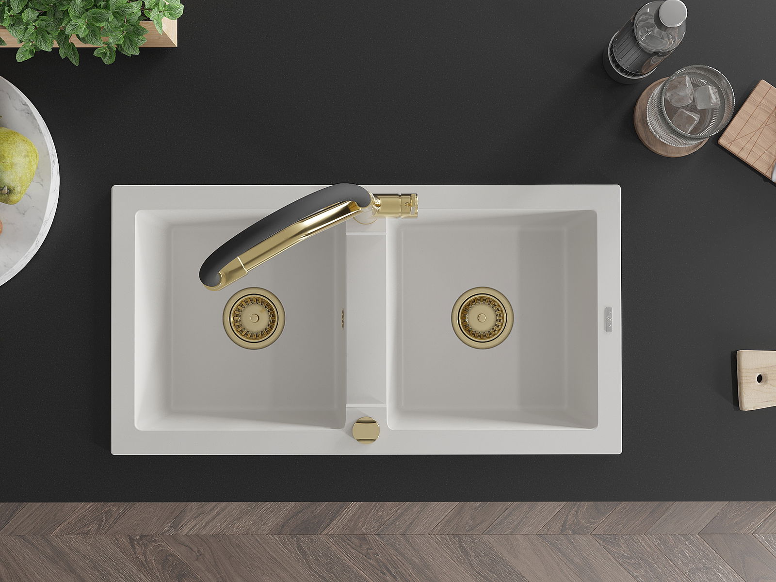 Mexen Mario granite double-bowl sink with Duo kitchen tap, white - 6504-20-671701-57-G