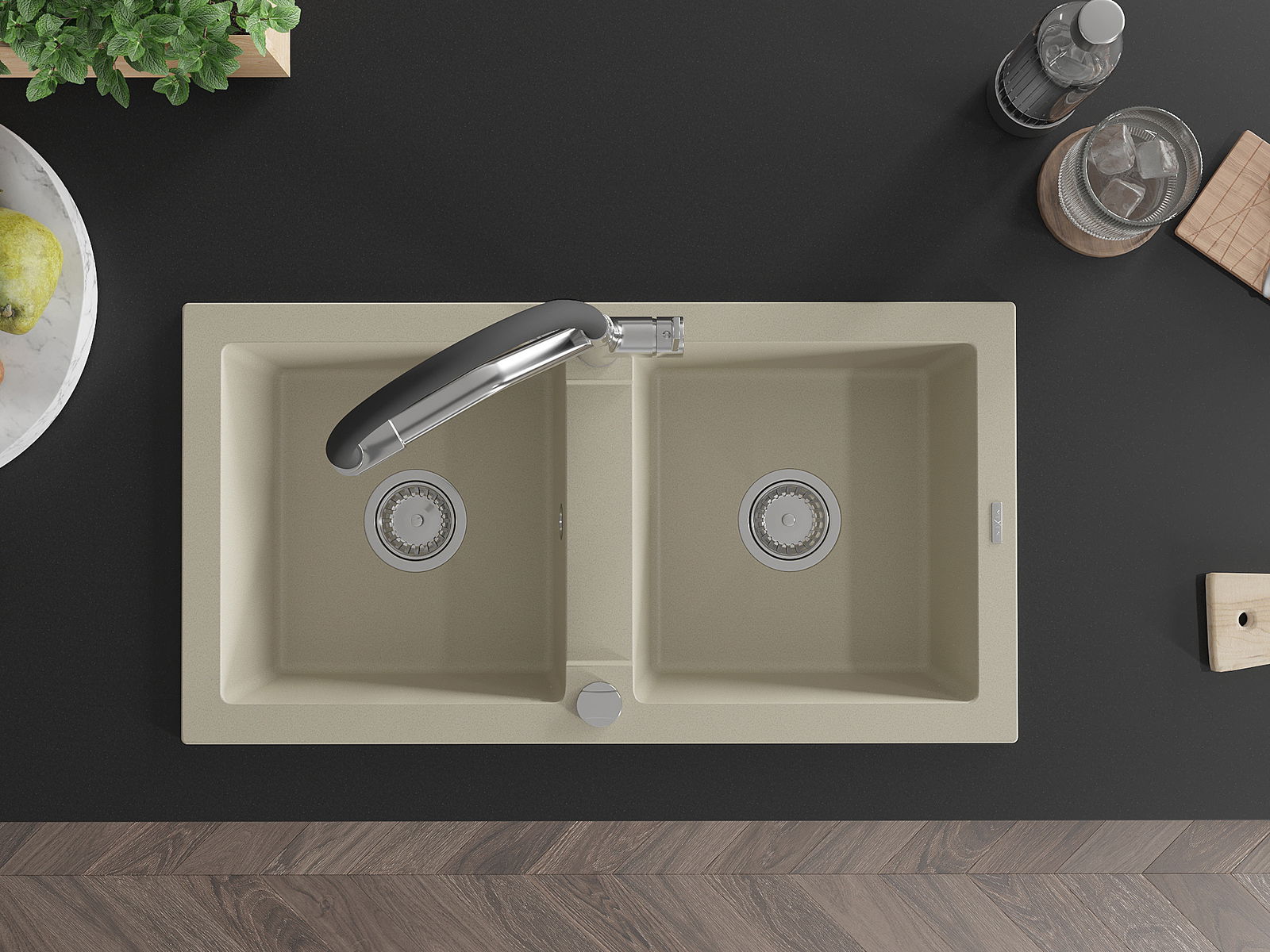 Mexen Mario granite kitchen sink 2-bowl with Duo kitchen tap, beige - 6504-69-671701-07