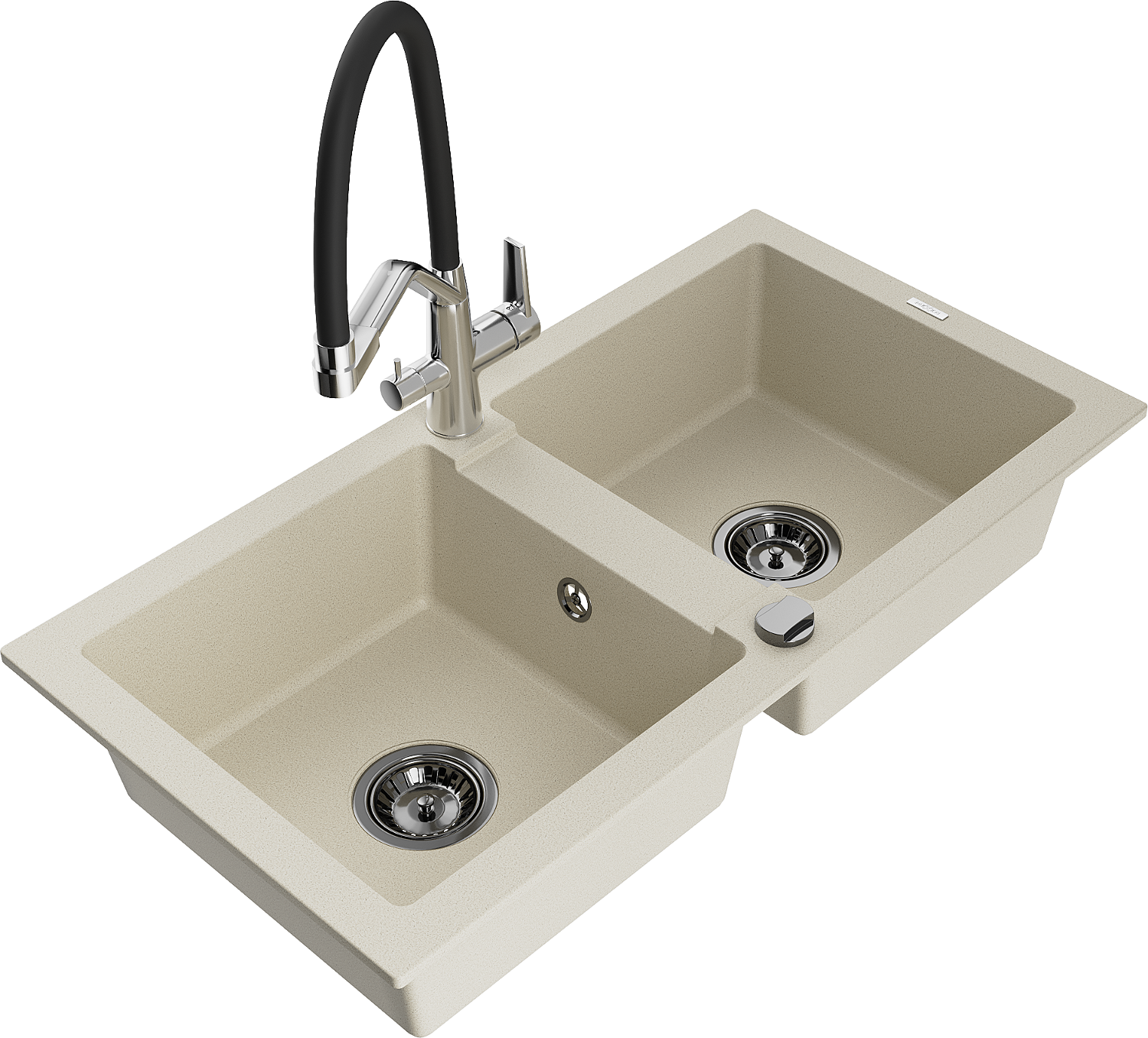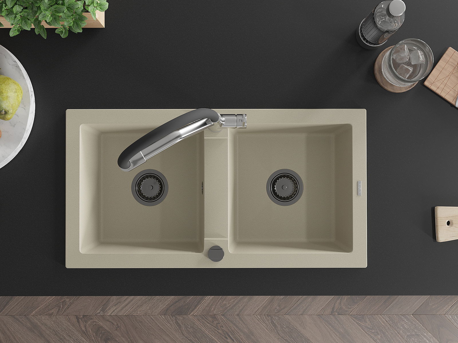 Mexen Mario granite sink 2-chamber with Duo kitchen tap, beige - 6504-69-671701-07-B